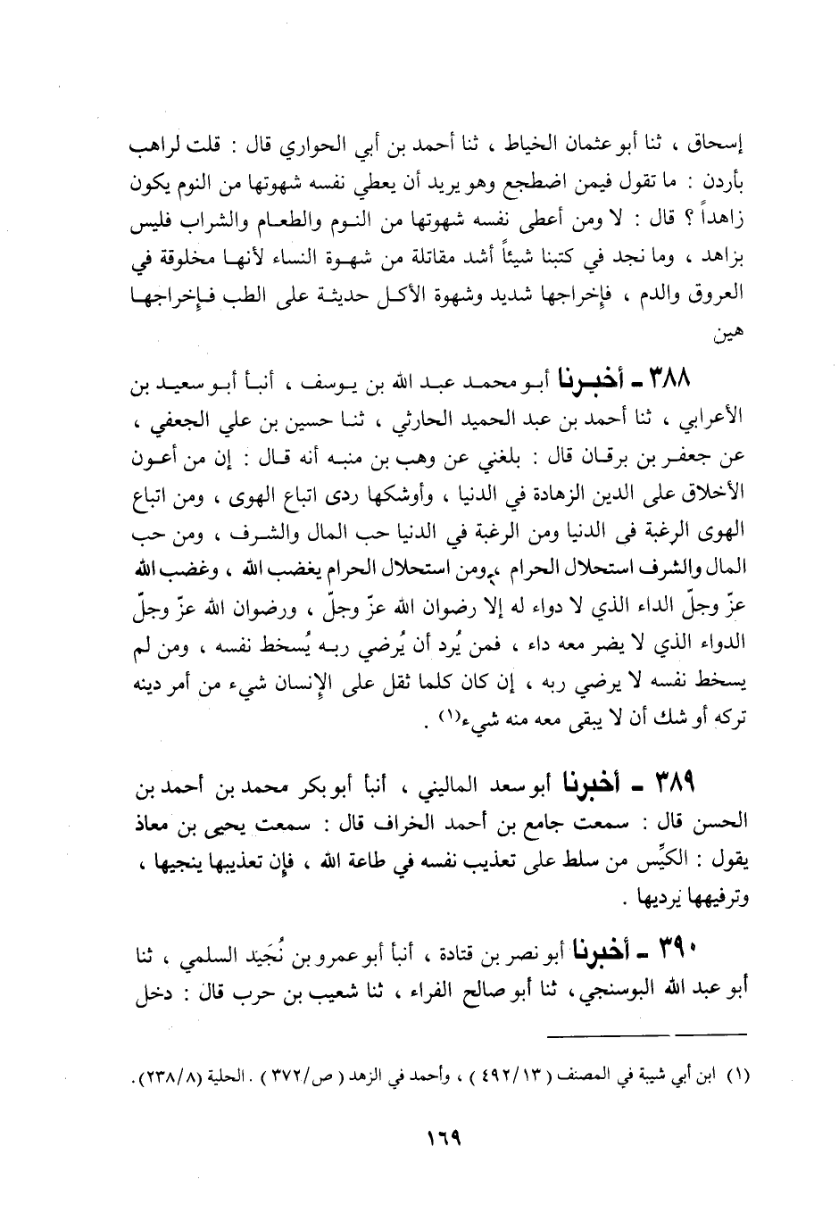 388 - أَخْبَرَنَا أَبُو مُحَمَّدٍ عَبْدُ اللَّهِ بْنُ يُوسُفَ، أَنْبَأَنَا أَبُو سَعِيدِ بْنُ الْأَعْرَابِيِّ، ثنا أَحْمَدُ بْنُ أَبِي الْحَوَارِيِّ الْحَارِثِيُّ، ثنا حُسَيْنُ بْنُ عَلِيٍّ الْجُعْفِيُّ، عَنْ جَعْفَرِ بْنِ بُرْقَانَ قَالَ: بَلَغَنِي عَنْ وَهْبِ بْنِ مُنَبِّهٍ أَنَّهُ قَالَ: «إِنَّ §مِنْ أَعْوَنِ الْأَخْلَاقِ عَلَى الدِّينِ الزَّهَادَةَ فِي الدُّنْيَا، وَأَوْشَكِهَا رَدًى اتِّبَاعَ الْهَوَى، وَمِنَ اتِّبَاعِ الْهَوَى الرَّغْبَةُ فِي الدُّنْيَا، وَمِنَ الرَّغْبَةِ فِي الدُّنْيَا حُبُّ الْمَالِ وَالشَّرَفِ، وَمِنْ حُبِّ الْمَالِ وَالشَّرَفِ اسْتِحْلَالُ الْحَرَامِ، وَمِنَ اسْتِحْلَالِ الْحَرَامِ يَغْضَبُ اللَّهَ، وَغَضَبُ اللَّهِ عَزَّ وَجَلَّ الدَّاءُ الَّذِي لَا دَوَاءَ لَهُ إِلَّا رِضْوَانُ اللَّهِ عَزَّ وَجَلَّ، وَرِضْوَانُ اللَّهِ عَزَّ وَجَلَّ الدَّوَاءُ الَّذِي لَا يَضُرُّ مَعَهُ دَاءٌ، فَمَنْ يُرِدِ أَنْ يُرْضِيَ رَبَّهُ يُسْخِطْ نَفْسَهُ، وَمَنْ لَمْ يُسْخِطْ نَفْسَهُ لَا يُرْضِ رَبَّهُ، إِنْ كَانَ كُلَّمَا ثَقُلَ عَلَى الْإِنْسَانِ شَيْءٌ مِنْ أَمْرِ دِينِهِ تَرَكَهُ أَوْشَكَ أَنْ لَا يَبْقَى مَعَهُ مِنْهُ شَيْءٌ»