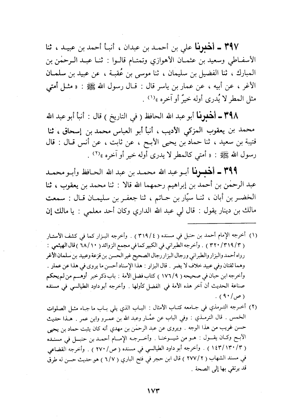 397 - أَخْبَرَنَا عَلِيُّ بْنُ أَحْمَدَ بْنِ عَبْدَانَ، أَنْبَأَنَا أَحْمَدُ بْنُ عُبَيْدٍ، ثنا الْأَسْفَاطِيُّ، وَسَعِيدُ بْنُ عُثْمَانَ الْأَهْوَازِيُّ، وَتَمْتَامٌ، قَالُوا: ثنا عَبْدُ الرَّحْمَنِ بْنُ الْمُبَارَكِ، ثنا الْفَضْلُ بْنُ سُلَيْمَانَ، ثنا مُوسَى بْنُ عُقْبَةَ، عَنْ عُبَيْدِ بْنِ سَلْمَانَ الْأَغَرِّ، عَنْ أَبِيهِ، عَنْ عَمَّارِ بْنِ يَاسِرٍ قَالَ: قَالَ رَسُولُ اللَّهِ صَلَّى اللهُ عَلَيْهِ وَسَلَّمَ: §«مَثَلُ أُمَّتِي مَثَلُ الْمَطَرِ؛ لَا يُدْرَى أَوَّلُهُ خَيْرٌ أَوْ آخِرُهُ»