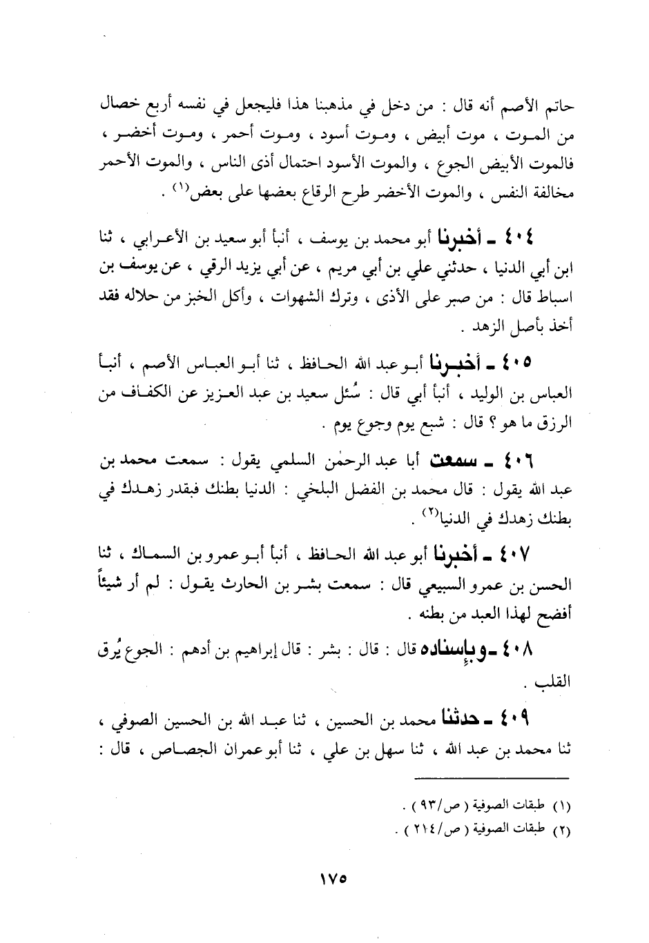 409 - حَدَّثَنَا مُحَمَّدُ بْنُ الْحُسَيْنِ، ثنا عَبْدُ اللَّهِ بْنُ الْحُسَيْنِ الصُّوفِيُّ، ثنا مُحَمَّدُ بْنُ عَبْدِ اللَّهِ، ثنا سَهْلُ بْنُ عَلِيٍّ، ثنا أَبُو عِمْرَانَ الْجَصَّاصُ قَالَ -[176]-: سَمِعْتُ أَبَا سُلَيْمَانَ يَقُولُ: «§إِذَا جَاعَ الْقَلْبُ وَعَطَشَ صَفَا وَرَقَّ، وَإِذَا شَبِعَ وَرُوِيَ عَمِيَ»