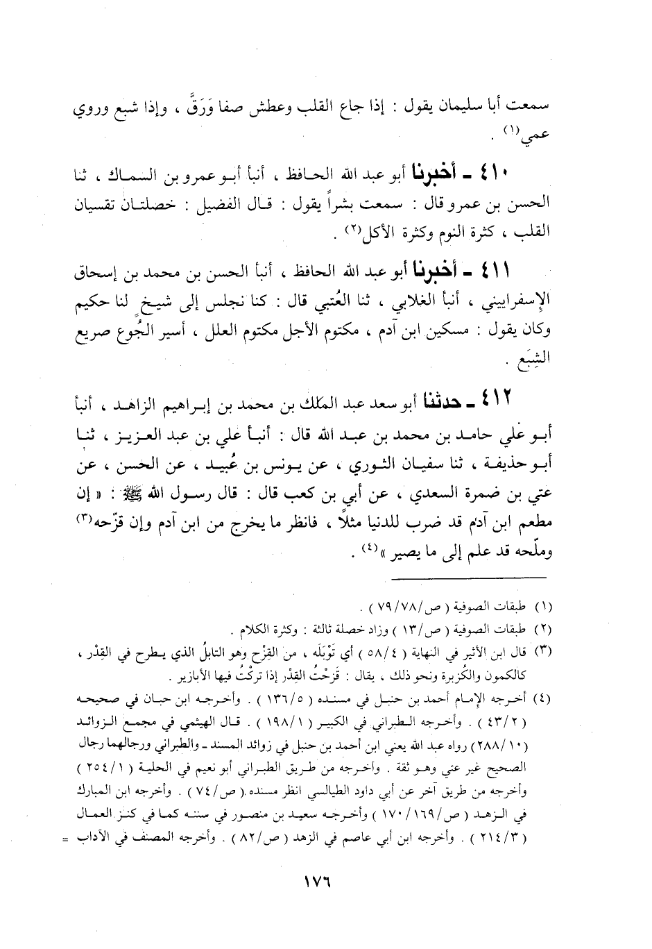 412 - حَدَّثَنَا أَبُو سَعْدٍ عَبْدُ الْمَلِكِ بْنُ مُحَمَّدِ بْنِ إِبْرَاهِيمَ الزَّاهِدُ، أَنْبَأَنَا أَبُو عَلِيِّ حَامِدُ بْنُ مُحَمَّدِ بْنِ عَبْدِ اللَّهِ قَالَ: أَنْبَأَنَا عَلِيُّ بْنُ عَبْدِ الْعَزِيزِ، ثنا أَبُو حُذَيْفَةَ، ثنا سُفْيَانُ الثَّوْرِيُّ، عَنْ يُونُسَ بْنِ عُبَيْدٍ، عَنِ الْحَسَنِ، عَنْ عُتَيِّ بْنِ ضَمْرَةَ السَّعْدِيِّ، عَنِ أُبَيِّ بْنِ كَعْبٍ رَضِيَ اللَّهُ عَنْهُ قَالَ: قَالَ رَسُولُ اللَّهِ صَلَّى اللهُ عَلَيْهِ وَسَلَّمَ: «§إِنَّ مَطْعَمَ ابْنِ آدَمَ قَدْ ضَرَبَ لِلدُّنْيَا مَثَلًا، فَانْظُرْ مَا يَخْرُجُ مِنَ ابْنِ آدَمَ، وَإِنْ قَزَّحَهُ وَمَلَّحَهُ قَدْ عَلِمَ إِلَى مَا يَصِيرُ»