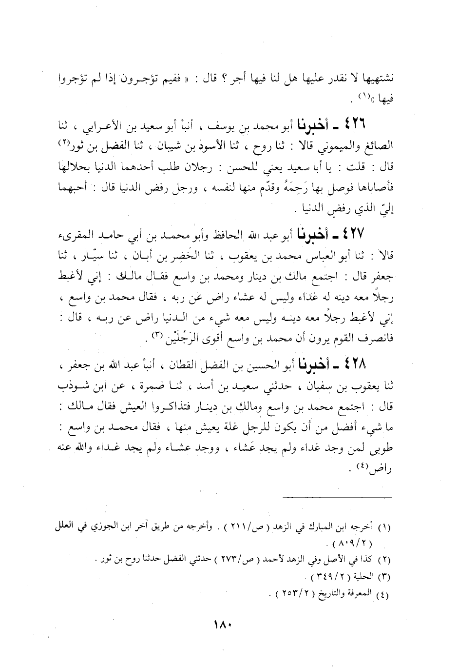 426 - أَخْبَرَنَا أَبُو مُحَمَّدِ بْنُ يُوسُفَ، أَنْبَأَنَا أَبُو سَعِيدِ بْنُ الْأَعْرَابِيِّ، ثنا الصَّائِغُ، وَالْمَيْمُونِيُّ، قَالَا: ثنا رَوْحٌ، ثنا الْأَسْوَدُ بْنُ شَيْبَانَ، ثنا الْفَضْلُ بْنُ ثَوْرٍ قَالَ: قُلْتُ: يَا أَبَا سَعِيدٍ يَعْنِي لِلْحَسَنِ: " §رَجُلَانِ طَلَبَ أَحَدُهُمَا الدُّنْيَا بِحَلَالِهَا، فَأَصَابَاهَا، فَوَصَلَ بِهَا رَحِمَهُ وَقَدَّمَ مِنْهَا لِنَفْسِهِ، وَرَجُلٌ رَفَضَ الدُّنْيَا قَالَ: أَحَبُّهُمَا إِلَيَّ الَّذِي رَفَضَ الدُّنْيَا "