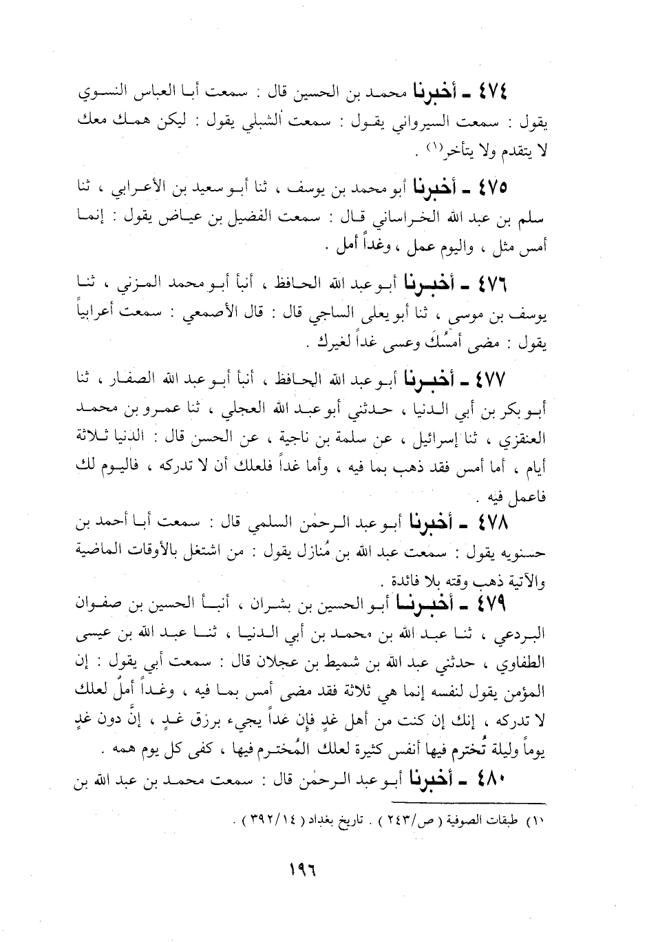 478 - أَخْبَرَنَا أَبُو عَبْدِ الرَّحْمَنِ السُّلَمِيُّ قَالَ: سَمِعْتُ أَحْمَدَ بْنَ حَسْنَوَيْهِ يَقُولُ: سَمِعْتُ عَبْدَ اللَّهِ بْنَ مُنَازِلٍ يَقُولُ: §«مَنِ اشْتَغَلَ بِالْأَوْقَاتِ الْمَاضِيَةِ وَالْآتِيَةِ ذَهَبَ وَقْتُهُ بِلَا فَائِدَةٍ»