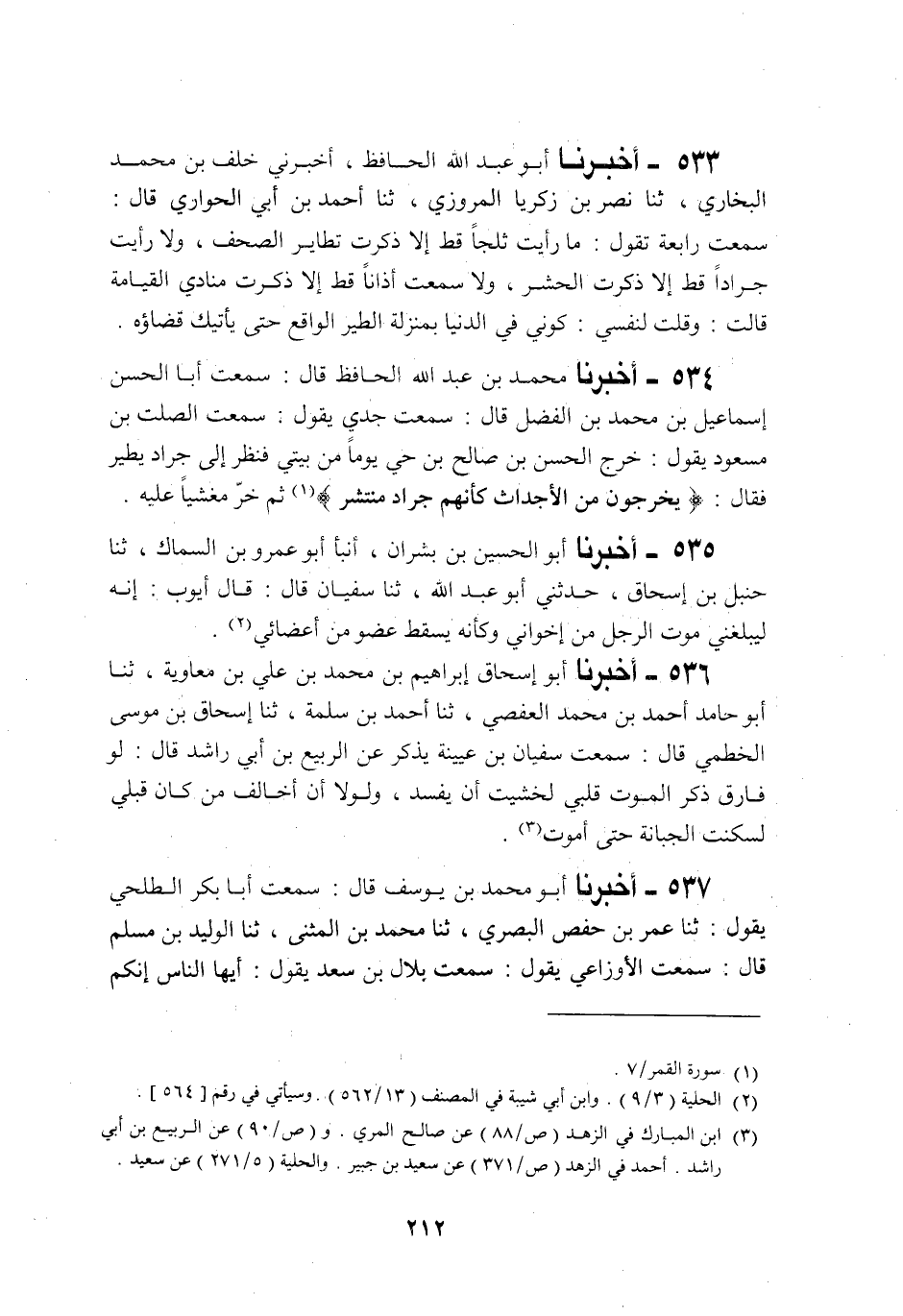 534 - أَخْبَرَنَا مُحَمَّدُ بْنُ عَبْدِ اللَّهِ الْحَافِظُ قَالَ: سَمِعْتُ أَبَا الْحَسَنِ إِسْمَاعِيلَ بْنَ مَسْعُودٍ يَقُولُ: " خَرَجَ الْحَسَنُ بْنُ صَالِحِ بْنِ حَيٍّ يَوْمًا مِنْ بَيْتِي , فَنَظَرَ إِلَى جَرَادٍ يَطِيرُ، فَقَالَ: {§يَخْرُجُونَ مِنَ الْأَجْدَاثِ كَأَنَّهُمْ جَرَادٌ مُنْتَشِرٌ} [القمر: 7] ثُمَّ خَرَّ مَغْشِيًّا عَلَيْهِ "