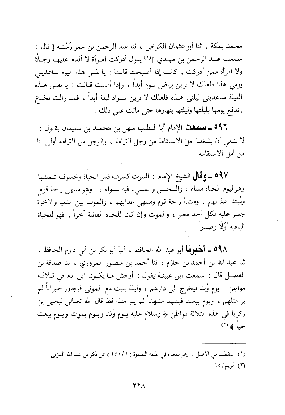 598 - أَخْبَرَنَا أَبُو عَبْدِ اللَّهِ الْحَافِظُ، أَنْبَأَنَا أَبُو بَكْرُ بْنُ أَبِي دَارِمٍ الْحَافِظُ، ثنا عُبَيْدُ اللَّهِ بْنُ أَحْمَدَ بْنِ حَازِمٍ، ثنا أَحْمَدُ بْنُ مَنْصُورٍ الْمَرْوَزِيُّ، ثنا صَدَقَةُ بْنُ الْفَضْلِ قَالَ: سَمِعْتُ ابْنَ عُيَيْنَةَ يَقُولُ: " §أَوْحَشُ مَا يَكُونَ ابْنُ آدَمَ فِي ثَلَاثَةِ مَوَاطِنَ: فِي يَوْمِ وُلِدَ فَيَخْرُجُ إِلَى دَارِ هَمٍّ، وَلَيْلَةِ يَبِيتُ مَعَ الْمَوْتَى فَيُجَاوِرُ جِيرَانًا لَمْ يَرَ مِثْلَهُمْ، وَيَوْمِ يُبْعَثُ فَيَشْهَدُ مَشْهَدًا لَمْ يَرَ مِثْلَهُ قَطُّ، قَالَ اللَّهُ تَعَالَى: لِيَحْيَى بْنِ زَكَرِيَّا فِي هَذِهِ الثَلَاثَةِ مَوَاطِنِ: {وَسَلَامٌ عَلَيْهِ يَوْمَ وُلِدَ وَيَوْمَ يَمُوتُ وَيَوْمَ يُبْعَثُ حَيًّا} [مريم: 15] "