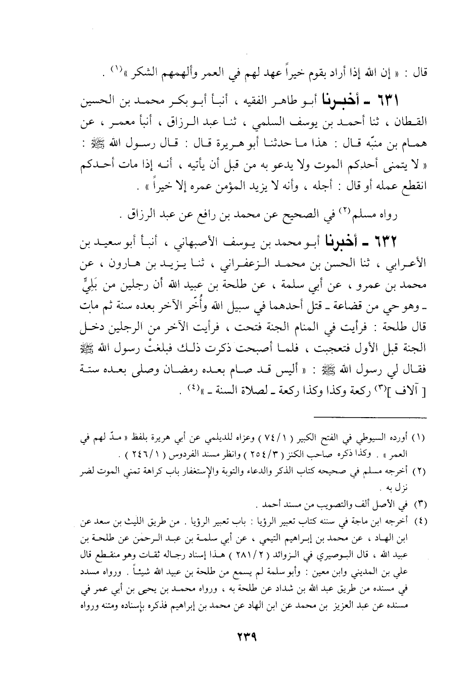 631 - أَخْبَرَنَا أَبُو طَاهِرٍ الْفَقِيهُ، أَنْبَأَنَا أَبُو بَكْرٍ مُحَمَّدُ بْنُ الْحُسَيْنِ الْقَطَّانُ، ثنا أَحْمَدُ بْنُ يُوسُفَ السُّلَمِيُّ، ثنا عَبْدُ الرَّزَّاقِ، أَنْبَأَنَا مَعْمَرٌ، عَنْ هَمَّامِ بْنِ مُنَبِّهٍ قَالَ: هَذَا مَا حَدَّثَنَا أَبُو هُرَيْرَةَ رَضِيَ اللَّهُ عَنْهُ قَالَ: قَالَ رَسُولُ اللَّهِ صَلَّى اللهُ عَلَيْهِ وَسَلَّمَ: §" لَا يَتَمَنَّى أَحَدُكُمُ الْمَوْتَ وَلَا يَدْعُو بِهِ مِنْ قَبْلِ أَنْ يَأْتِيَهُ، إِنَّهُ إِذَا مَاتَ أَحَدُكُمُ انْقَطَعَ عَمَلُهُ أَوْ قَالَ: أَجَلُهُ، وَأَنَّهُ لَا يَزِيدُ الْمُؤْمِنَ عُمُرُهُ إِلَّا خَيْرًا " رَوَاهُ مُسْلِمٌ فِي الصَّحِيحِ عَنْ مُحَمَّدِ بْنِ نَافِعٍ، عَنْ عَبْدِ الرَّزَّاقِ