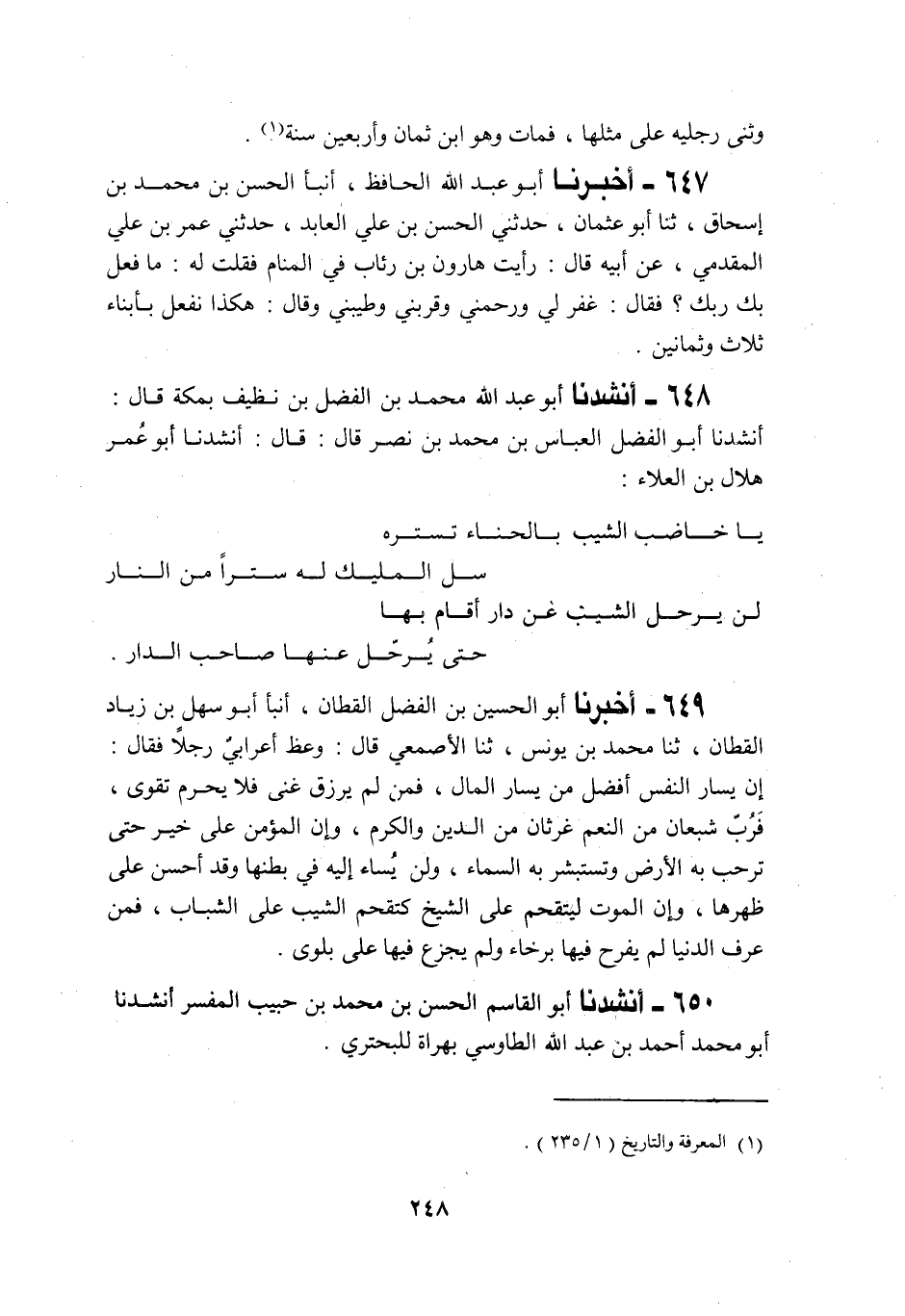 648 - أَنْشَدَنَا أَبُو عَبْدِ اللَّهِ مُحَمَّدُ بْنُ الْفَضْلِ بْنِ نَظِيفٍ بِمَكَّةَ قَالَ: أَنْشَدَنَا أَبُو الْفَضْلِ الْعَبَّاسُ بْنُ مُحَمَّدِ بْنِ نَصْرٍ قَالَ: قَالَ: أَنْشَدَنَا أَبُو عَمْرٍو هِلَالُ بْنُ الْعَلَاءِ: «