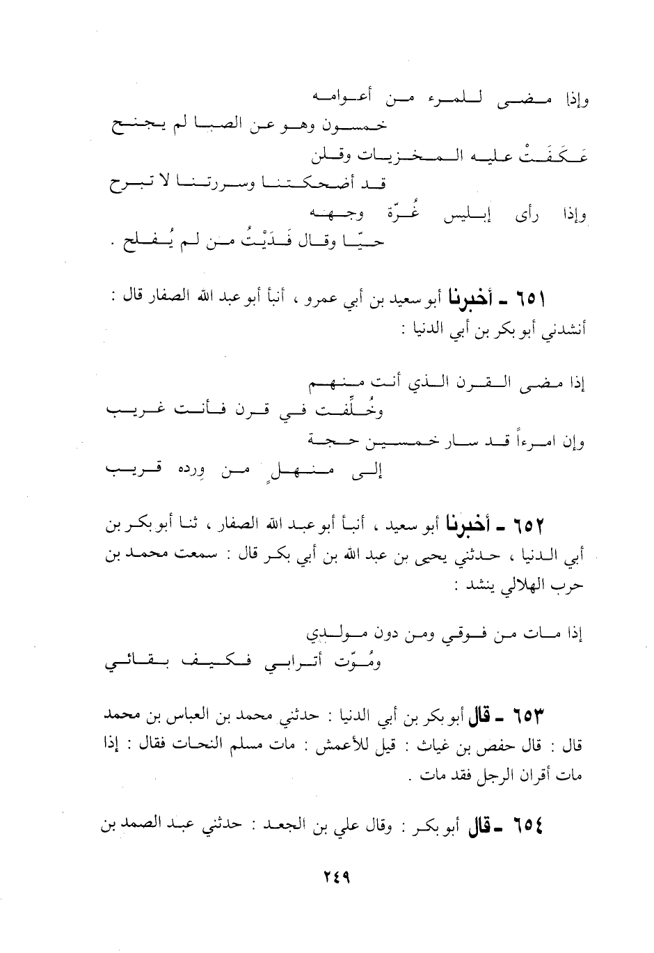 651 - أَخْبَرَنَا أَبُو سَعِيدِ بْنُ أَبِي عَمْرٍو، أَنْبَأَ أَبُو عَبْدِ اللَّهِ الصَّفَّارُ قَالَ: أَنْشَدَنِي أَبُو بَكْرِ بْنُ أَبِي الدُّنْيَا: «