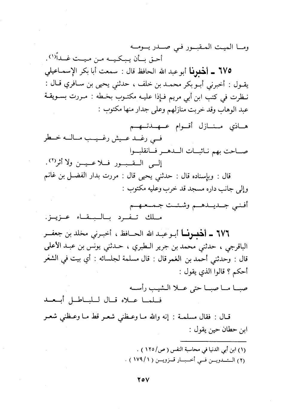 676 - أَخْبَرَنَا أَبُو عَبْدِ اللَّهِ الْحَافِظُ، أَخْبَرَنِي مَخْلَدُ بْنُ جَعْفَرٍ الْبَاقُرْجِيُّ، حَدَّثَنِي مُحَمَّدُ بْنُ جَرِيرٍ الطَّبَرِيُّ، حَدَّثَنِي يُونُسُ بْنُ عَبْدِ الْأَعْلَى قَالَ: وَحَدَّثَنِي أَحْمَدُ بْنُ الْغُمْرِ قَالَ: قَالَ مَسْلَمَةُ لِجُلَسَائِهِ: §أَيُّ بَيْتٍ فِي الشِّعْرِ أَحْكَمُ؟ قَالُوا: الَّذِي يَقُولُ: