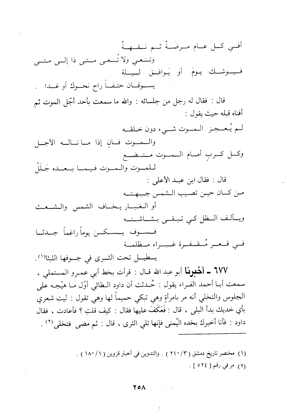 677 - أَخْبَرَنَا أَبُو عَبْدِ اللَّهِ قَالَ: قَرَأْتُ بِخَطِّ أَبِي عَمْرٍو الْمُسْتَمْلِي سَمِعْتُ أَبَا أَحْمَدَ الْفَرَّاءَ يَقُولُ: حُدِّثْتُ أَنَّ دَاوُدَ الطَّائِيَّ أَوَّلُ مَا هَيَّجَهُ عَلَى الْجُلُوسِ، وَالتَّخَلِّي أَنَّهُ مَرَّ بِامْرَأَةٍ وَهِيَ تَبْكِي حَمِيمًا لَهَا وَهِيَ تَقُولُ: " §لَيْتَ شِعْرِي بِأَيِّ خَدَّيْكَ بَدَأَ الْبِلَى قَالَ: فَعَكَفَ عَلَيْهَا، فَقَالَ: كَيْفَ قُلْتِ؟ فَأَعَادَتْ، فَقَالَ دَاوُدُ: فَأَنَا أُخْبِرُكِ بِخَدِّهِ الْيُمْنَى؛ فَإِنَّهَا تَلِي الثَّرَى قَالَ: ثُمَّ مَضَى، فَتَخَلَّى "