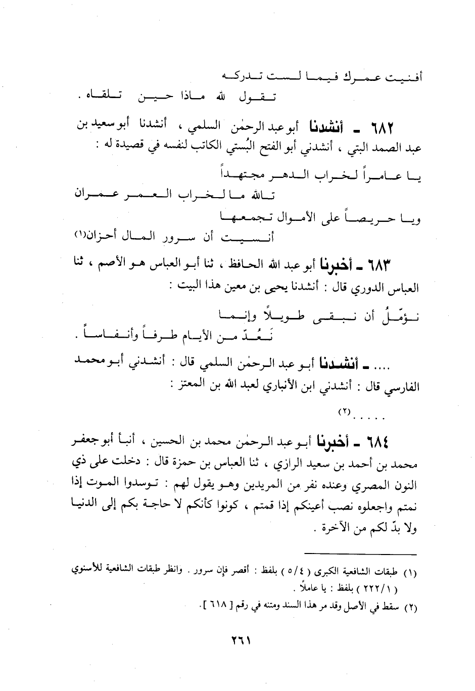 682 - أَنْشَدَنَا أَبُو عَبْدِ الرَّحْمَنِ السُّلَمِيُّ، أَنْشَدَنَا أَبُو سَعِيدِ بْنُ عَبْدِ الصَّمَدِ الْبُتِّيُّ، أَنْشَدَنِي أَبُو الْفَتْحِ الْبُسْتِيُّ الْكَاتِبُ لِنَفْسِهِ فِي قَصِيدَةٍ لَهُ: «