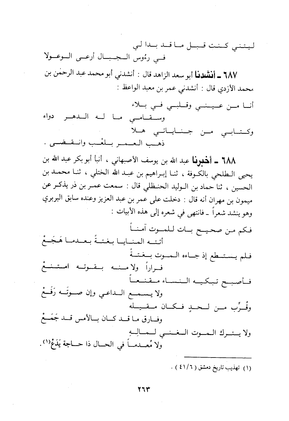 687 - أَنْشَدَنَا أَبُو سَعْدٍ الزَّاهِدُ قَالَ: أَنْشَدَنِي أَبُو مُحَمَّدٍ عَبْدُ الرَّحْمَنِ بْنُ مُحَمَّدٍ الْأَزْدِيُّ قَالَ: أَنْشَدَنِي عُمَرُ بْنُ مَعْبَدٍ الْوَاعِظُ: