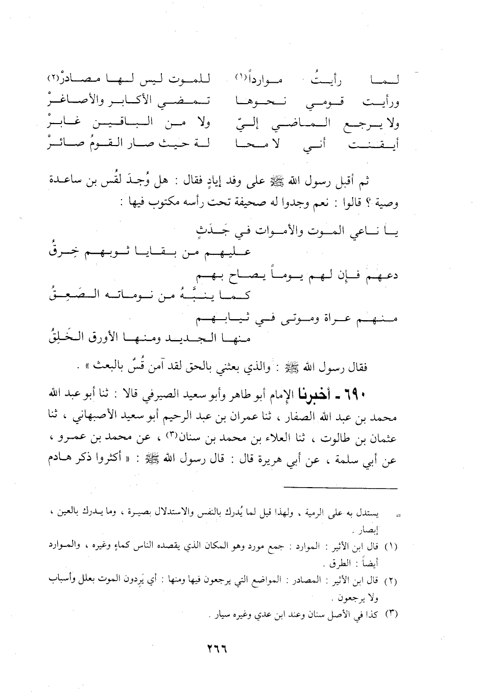 ثُمَّ أَقْبَلَ رَسُولُ اللَّهِ صَلَّى اللهُ عَلَيْهِ وَسَلَّمَ عَلَى وَفْدِ إِيَادٍ، فَقَالَ: «§هَلْ وُجِدَ لَقُسِّ بْنِ سَاعِدَةَ وَصِيَّةً؟» قَالُوا: نَعَمْ، وَجَدُوا لَهُ صَحِيفَةً تَحْتَ رَأْسِهِ مَكْتُوبٌ فِيهَا:
