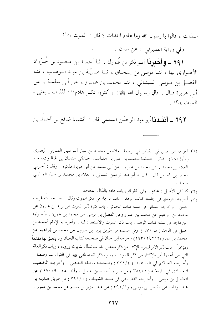 691 - وَأَخْبَرَنَا أَبُو بَكْرِ بْنُ فُورَكٍ، ثنا أَحْمَدُ بْنُ مَحْمُودِ بْنِ خُرَّزَادَ الْفَضْلِ بْنِ مُوسَى السِّينَانِيِّ، ثنا مُحَمَّدُ بْنُ عَمْرٍو، عَنْ أَبِي سَلَمَةَ، عَنْ أَبِي هُرَيْرَةَ رَضِيَ اللَّهُ عَنْهُ قَالَ: قَالَ رَسُولُ اللَّهِ صَلَّى اللهُ عَلَيْهِ وَسَلَّمَ: §«أَكْثِرُوا ذِكْرَ هَادِمِ اللَّذَّاتِ - يَعْنِي الْمَوْتَ»