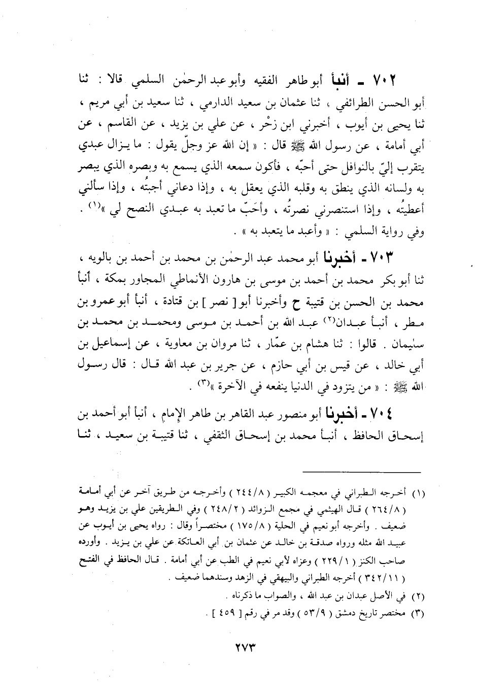 702 - أَنْبَأَنَا أَبُو طَاهِرٍ الْفَقِيهُ، وَأَبُو عَبْدِ الرَّحْمَنِ السُّلَمِيُّ، قَالَا: ثنا أَبُو الْحَسَنِ الطَّرَائِفِيُّ، ثنا عُثْمَانُ بْنُ سَعِيدٍ الدَّارَمِيُّ، ثنا سَعِيدُ بْنُ أَبِي مَرْيَمَ، ثنا يَحْيَى بْنُ أَيُّوبَ، أَخْبَرَنِي ابْنُ زَحْرٌ، عَنْ عَلِيِّ بْنِ يَزِيدَ، عَنِ الْقَاسِمِ، عَنْ أَبِي أُمَامَةَ عَنْ رَسُولِ اللَّهِ صَلَّى اللهُ عَلَيْهِ وَسَلَّمَ قَالَ: إِنَّ اللَّهَ عَزَّ وَجَلَّ يَقُولُ: «§مَا يَزَالُ عَبْدِي يَتَقَرَّبُ إِلَيَّ بِالنَّوَافِلِ حَتَّى أُحِبَّهُ، فَأَكُونَ سَمْعَهُ الَّذِي يَسْمَعُ بِهِ وَبَصَرَهُ الَّذِي يُبْصِرُ بِهِ وَلِسَانَهُ الَّذِي يَنْطِقُ بِهِ وَقَلْبَهُ الَّذِي يَعْقِلُ بِهِ وَإِذَا دَعَانِي أَجَبْتُهُ، وَإِذَا سَأَلَنِي أَعْطَيْتُهُ، وَإِذَا اسْتَنْصَرَنِي نَصَرْتُهُ، وَأَحَبُّ مَا تَعَبَّدَ بِهِ عَبْدِي النُّصْحُ لِي» وَفِي رِوَايَةِ السُّلَمِيِّ وَأَعْبَدُ مَا يَتَعَبَّدُ بِهِ