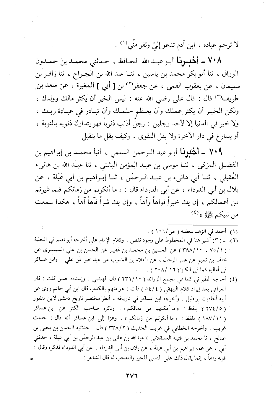 709 - أَخْبَرَنَا أَبُو عَبْدِ الرَّحْمَنِ السُّلَمِيُّ، أَنْبَأَنَا مُحَمَّدُ بْنُ إِبْرَاهِيمَ بْنِ الْفَضْلِ الْمُزَكِّي، ثنا مُوسَى بْنُ عَبْدِ الْمُؤْمِنِ الْبُشْتِيُّ، ثنا عَبْدُ اللَّهِ بْنُ هَانِئٍ الْعُقَيْلِيُّ، ثنا أَبِي هَانِئُ بْنُ عَبْدِ الرَّحْمَنِ، ثنا إِبْرَاهِيمُ بْنُ أَبِي عَبْلَةَ، عَنْ بِلَالِ بْنِ أَبِي الدَّرْدَاءِ، عَنْ أَبِي الدَّرْدَاءِ قَالَ: «§مَا أَنْكَرْتُمْ مِنْ زَمَانِكُمْ فَبِمَا غَيَّرْتُمْ مِنْ أَعْمَالِكُمْ، إِنْ يَكُ خَيْرًا، فَوَاهًا وَآهَا وَإِنْ يَكُ شَرًا فَآهًا آهًا، هَكَذَا سَمِعْتُ مِنْ نَبِيِّكُمْ صَلَّى اللهُ عَلَيْهِ وَسَلَّمَ» -[277]- لَا أَعْلَمُهُ إِلَّا مِنْ هَذَا الْوَجْهِ وَهُوَ مَتْنٌ غَرِيبٌ، تَفَرَّدَ بِهِ هَذَا الْعُقَيْلِيُّ