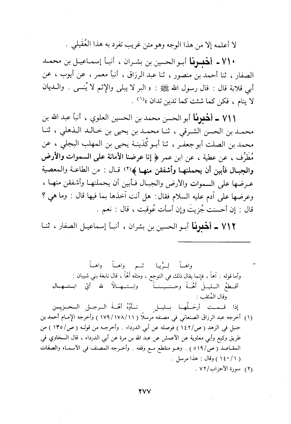 711 - أَخْبَرَنَا أَبُو الْحَسَنِ مُحَمَّدُ بْنُ الْحُسَيْنِ الْعَلَوِيُّ، أَنْبَأَنَا عَبْدُ اللَّهِ بْنِ مُحَمَّدِ بْنِ الْحَسَنِ الشَّرْقِيُّ، ثنا مُحَمَّدُ بْنُ يَحْيَى بْنِ خَالِدٍ الذُّهْلِيُّ، ثنا مُحَمَّدُ بْنُ الصَّلْتِ أَبُو جَعْفَرٍ، ثنا أَبُو كُدَيْنَةَ يَحْيَى بْنُ الْمُهَلِّبِ الْبَجَلِيُّ عَنْ مُطَرِّفٍ، عَنْ عَطِيَّةَ، عَنِ ابْنِ عُمَرَ رَضِيَ اللَّهُ عَنْهُمَا: " {§إِنَّا عَرَضْنَا الْأَمَانَةَ عَلَى السَّمَوَاتِ وَالْأَرْضِ وَالْجِبَالِ فَأَبَيْنَ أَنْ يَحْمِلْنَهَا وَأَشْفَقْنَ مِنْهَا} قَالَ: " مِنَ الطَّاعَةِ وَالْمَعْصِيَةِ عَرَضَهَا عَلَى السَّمَاوَاتِ وَالْأَرْضِ وَالْجِبَالِ، فَأَبَيْنَ أَنْ يَحْمِلْنَهَا وَأَشْفَقْنَ مِنْهَا وَعَرَضَهَا عَلَى آدَمَ عَلَيْهِ السَّلَامُ، فَقَالَ: هَلْ أَنْتَ آخِذُهَا بِمَا فِيهَا؟ قَالَ: وَمَا هِيَ؟ قَالَ: إِنْ أَحْسَنْتَ جُزِيتَ، وَإِنْ أَسَأْتَ عُوقِبْتَ قَالَ: نَعَمْ "