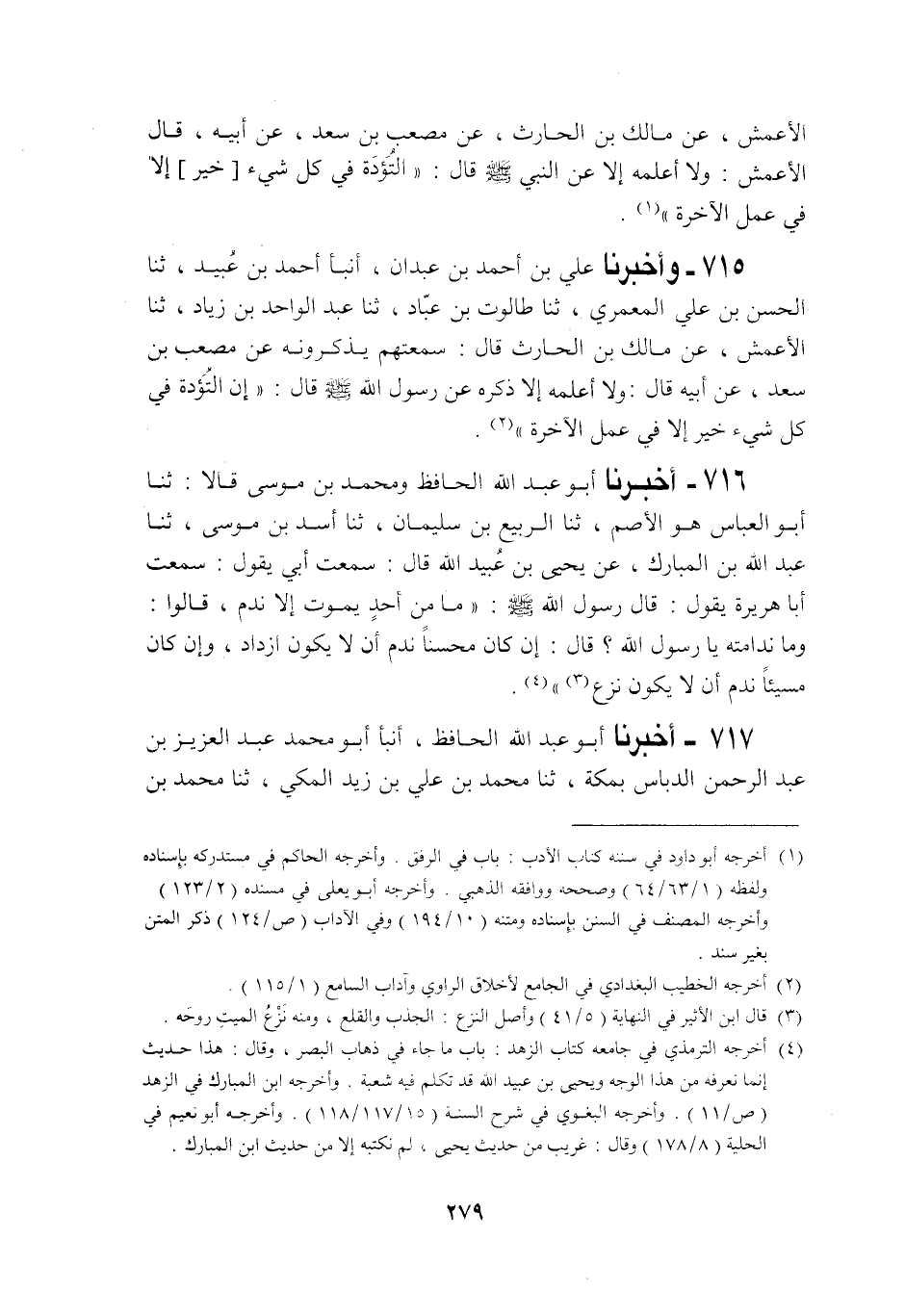 715 - وَأَخْبَرَنَا عَلِيُّ بْنُ أَحْمَدَ بْنِ عَبْدَانَ، أَنْبَأَنَا أَحْمَدُ بْنُ عُبَيْدٍ، ثنا الْحَسَنُ بْنُ عَلِيٍّ الْمِصْرِيُّ، ثنا طَالُوتُ بْنُ عَبَّادٍ، ثنا عَبْدُ الْوَاحِدِ بْنُ زِيَادٍ، ثنا الْأَعْمَشُ، عَنْ مَالِكِ بْنِ الْحَارِثِ قَالَ: سَمِعْتُهُمْ يَذْكُرُونَهُ عَنْ مُصْعَبِ بْنِ سَعْدٍ، عَنْ أَبِيهِ قَالَ: وَلَا أَعْلَمُهُ إِلَّا ذَكَرَهُ عَنْ رَسُولِ اللَّهِ صَلَّى اللهُ عَلَيْهِ وَسَلَّمَ قَالَ: §«إِنَّ التُّؤَدَةَ فِي كُلِّ شَيْءٍ خَيْرٌ إِلَّا فِي عَمَلِ الْآخِرَةِ»