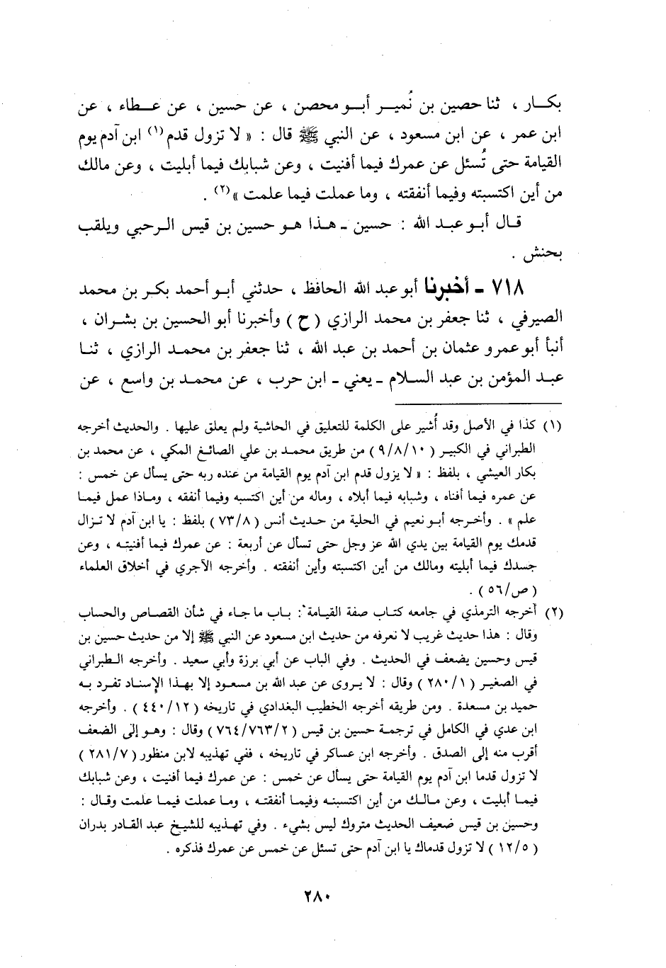 718 - أَخْبَرَنَا أَبُو عَبْدِ اللَّهِ الْحَافِظُ، حَدَّثَنِي أَبُو أَحْمَدَ بَكْرُ بْنُ مُحَمَّدٍ الصَّيْرَفِيُّ، ثنا جَعْفَرُ بْنُ مُحَمَّدٍ الرَّازِيُّ، ح وَأَخْبَرَنَا أَبُو الْحُسَيْنِ بْنُ بِشْرَانَ، أَنْبَأَنَا أَبُو عَمْرٍو عُثْمَانُ بْنُ أَحْمَدَ بْنِ عَبْدِ اللَّهِ، ثنا جَعْفَرُ بْنُ مُحَمَّدٍ الرَّازِيُّ، ثنا عَبْدُ الْمُؤْمِنِ، عَنْ عَبْدِ السَّلَامِ يَعْنِي ابْنَ حَرْبٍ، عَنْ مُحَمَّدِ بْنِ وَاسِعٍ، عَنِ ابْنِ -[281]- نَهَّارٍ الْعَبْدِيِّ، عَنْ أَبِي سَعِيدٍ قَالَ: قَالَ رَسُولُ اللَّهِ صَلَّى اللهُ عَلَيْهِ وَسَلَّمَ: يَقُولُ اللَّهُ تَبَارَكَ وَتَعَالَى: §«لَوْ أَطَاعُونِي عِبَادِي لَأَطْلَعْتُ عَلَيْهِمُ الشَّمْسَ بِالنَّهَارِ وَلَأَمْطَرْتُ عَلَيْهِمُ الْمَطَرَ بِاللَّيْلِ، وَلَمَا أَسْمَعْتُهُمْ صَوْتَ الرَّعْدِ» كَذَا قَالَا