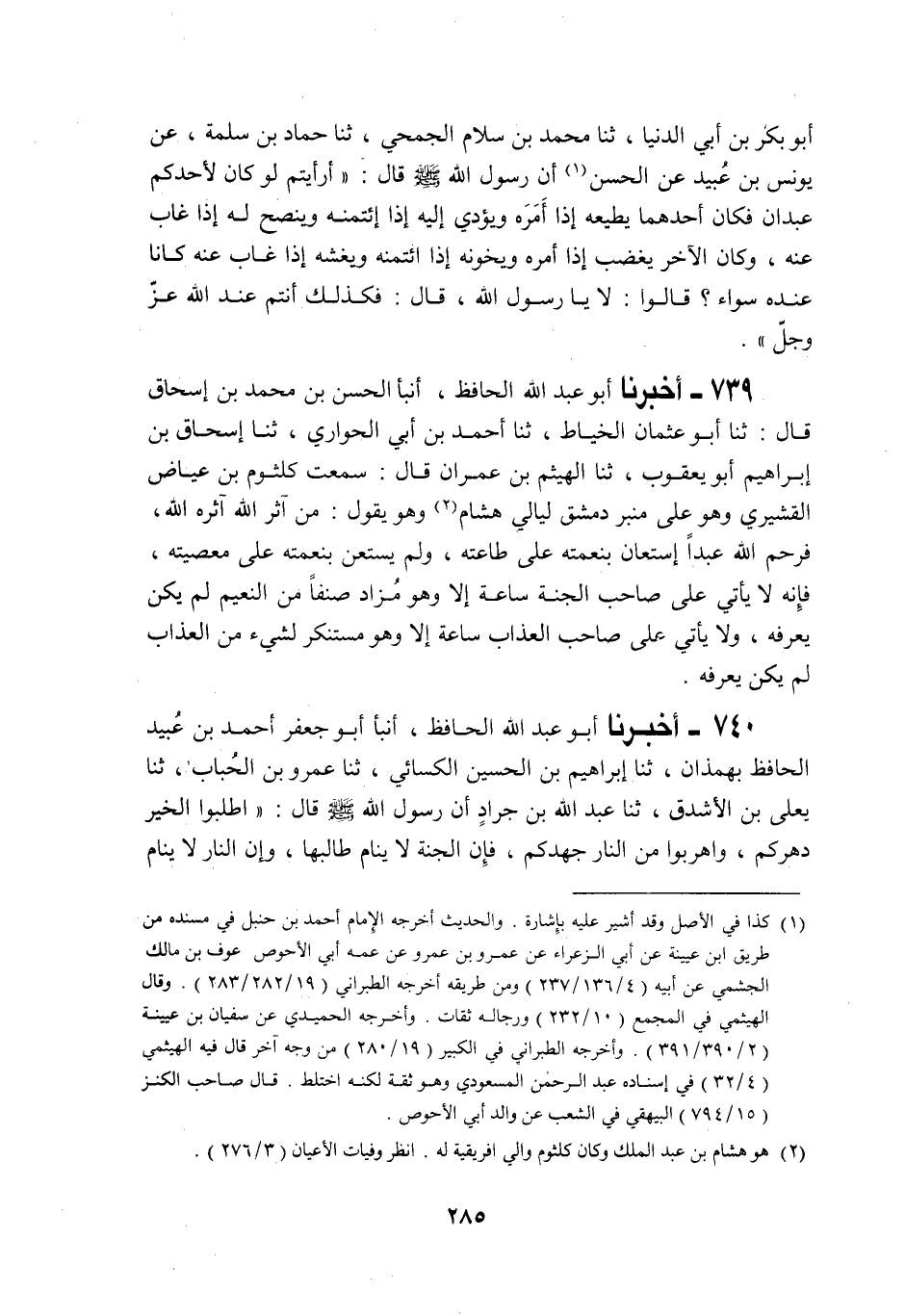 739 - أَخْبَرَنَا أَبُو عَبْدِ اللَّهِ الْحَافِظُ، أَنْبَأَنَا الْحَسَنُ بْنُ مُحَمَّدِ بْنِ إِسْحَاقَ قَالَ: ثنا أَبُو عُثْمَانَ الْحَنَّاطُ، ثنا أَحْمَدُ بْنُ أَبِي الْحَوَارِيِّ، ثنا إِسْحَاقُ بْنُ إِبْرَاهِيمَ أَبُو يَعْقُوبَ، ثنا الْهَيْثَمُ بْنُ عِمْرَانَ قَالَ: سَمِعْتُ كُلْثُومَ بْنَ عِيَاضٍ الْقُشَيْرِيَّ، وَهُوَ عَلَى مِنْبَرِ دِمَشْقَ لَيَالِيَ هِشَامٍ وَهُوَ يَقُولُ: «§مَنْ آثَرَ اللَّهَ آثَرَهُ اللَّهُ، فَرَحِمَ اللَّهُ عَبْدًا اسْتَعَانَ بِنِعْمَتِهِ عَلَى طَاعَتِهِ، وَلَمْ يَسْتَعِنْ بِنِعْمَتِهِ عَلَى مَعْصِيَتِهِ، فَإِنَّهُ لَا يَأْتِي عَلَى صَاحِبِ الْحَسَنَةِ سَاعَةٌ إِلَّا وَهُوَ مُزَادٌ صِنْفًا مِنَ النَّعِيمِ لَا يَكُونُ يَعْرِفُهُ، وَلَا يَأْتِي عَلَى صَاحِبِ الْعَذَابِ سَاعَةٌ إِلَّا وَهُوَ مُسْتَنْكِرٌ لِشَيْءٍ مِنَ الْعَذَابِ لَا يَكُونُ يَعْرِفُهُ»