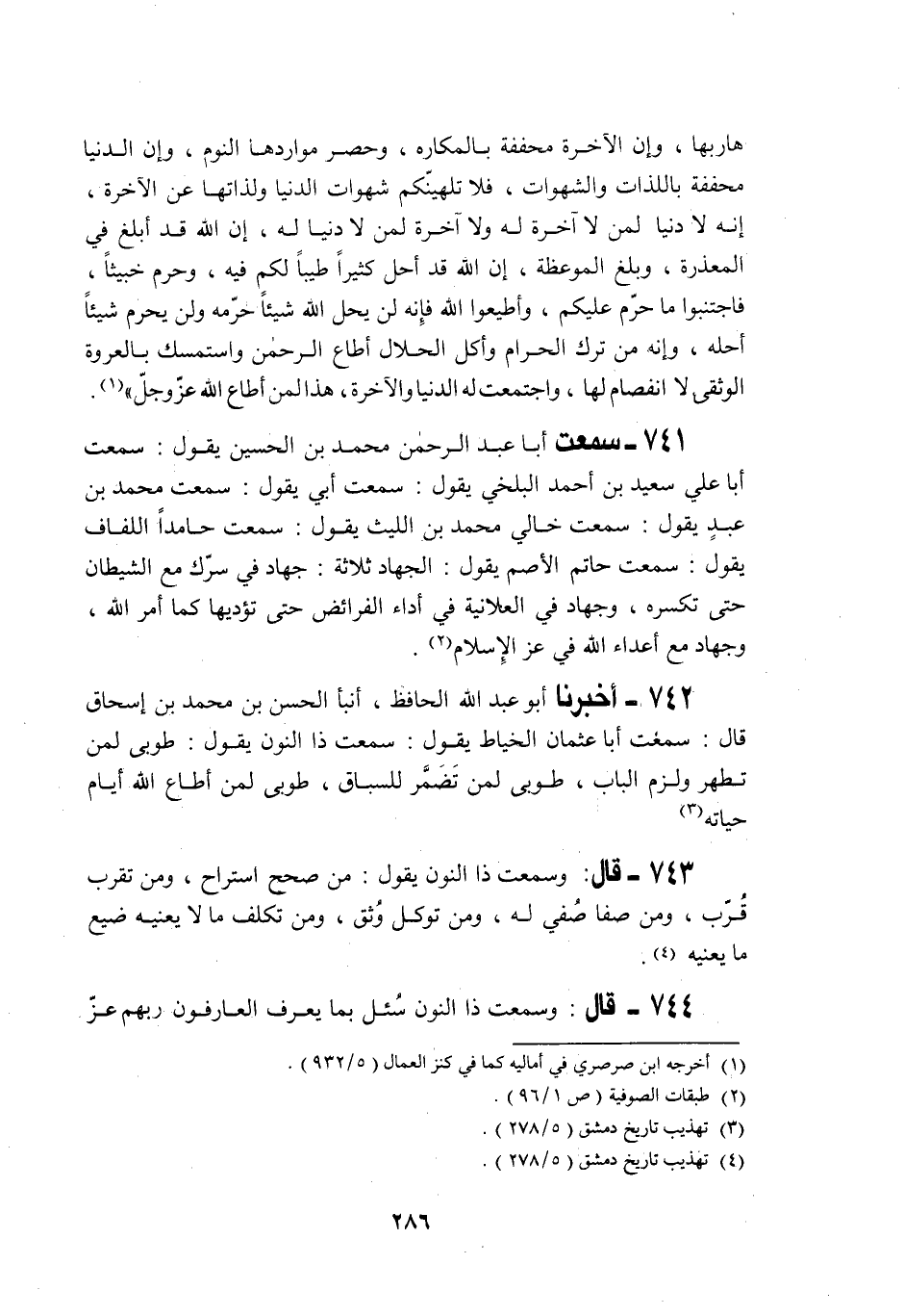 743 - قَالَ: وَسَمِعْتُ ذَا النُّونِ يَقُولُ: «§مَنْ صَحَّحَ اسْتَرَاحَ، وَمَنْ تَقَرَّبَ قُرِّبَ، وَمَنْ صَفَا صُفِيَ لَهُ، وَمَنْ تَوَكَّلَ وَثِقَ، وَمَنْ تَكَلَّفَ مَا لَا يَعْنِيهِ ضَيَّعَ مَا يَعْنِيهِ»