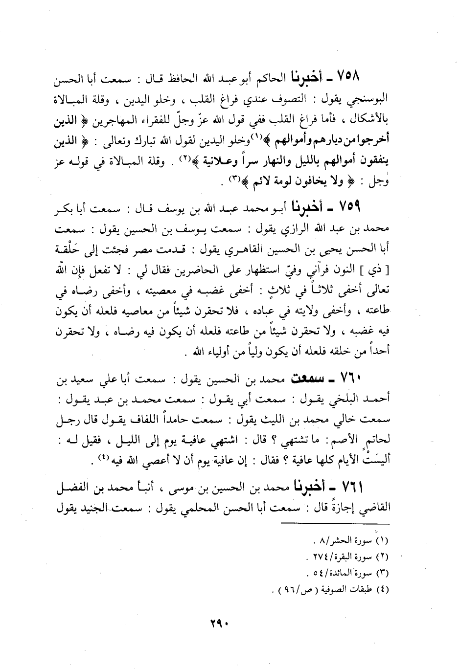 758 - أَخْبَرَنَا الْحَاكِمُ أَبُو عَبْدِ اللَّهِ الْحَافِظُ قَالَ: سَمِعْتُ أَبَا الْحَسَنِ الْبُوشَنْجِيَّ يَقُولُ: " §التَّصَوُّفُ عِنْدِي فَرَاغُ الْقَلْبِ، وَخُلُوُّ الْيَدَيْنِ، وَقِلَّةُ الْمُبَالِاةِ بِالْأَشْكَالِ، فَأَمَّا فَرَاغُ الْقَلْبِ فِفِي قَوْلِ اللَّهِ عَزَّ وَجَلَّ: {لِلْفُقَرَاءِ الْمُهَاجِرِينَ الَّذِينَ أُخْرِجُوا مِنْ دِيَارِهِمْ وَأَمْوَالِهِمْ} [الحشر: 8] ، وَخُلُوُّ الْيَدَيْنِ لِقَوْلِهِ تَبَارَكَ وَتَعَالَى: {الَّذِينَ يُنْفِقُونَ أَمْوَالَهُمْ بِاللَّيْلِ وَالنَّهَارِ سِرًّا وَعَلَانِيَةً} [البقرة: 274] ، وَقِلَّةُ الْمُبَالِاةِ فِي قَوْلِهِ عَزَّ وَجَلَّ: {وَلَا يَخَافُونَ لَوْمَةَ لَائِمٍ} "