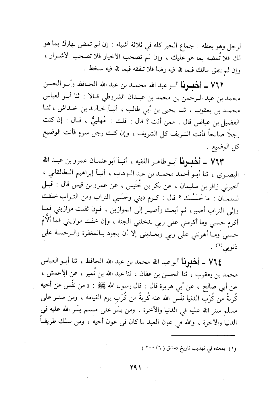 763 - أَخْبَرَنَا أَبُو طَاهِرٍ الْفَقِيهُ، أَنْبَأَنَا أَبُو عُثْمَانَ عَمْرُو بْنُ عَبْدِ اللَّهِ الْبَصْرِيُّ، ثنا أَبُو أَحْمَدَ مُحَمَّدُ بْنُ عَبْدِ الْوَهَّابِ، أَنْبَأَ إِبْرَاهِيمُ الطَّالْقَانِيُّ، أَخْبَرَنِي زَافِرُ بْنُ سُلَيْمَانَ، عَنْ بَكْرِ بْنِ خُنَيْسٍ، عَنْ عَمْرِو بْنِ قَيْسٍ قَالَ: قِيلَ لِسَلْمَانَ: §مَا حَسَبُكَ؟ قَالَ: «كَرَمِي دِينِي، وَحَسْبِيَ التُّرَابُ، وَمِنَ التُّرَابِ خُلِقْتُ، وَإِلَى التُّرَابِ أَصِيرُ، ثُمَّ أُبْعَثُ وَأَصِيرُ إِلَى الْمَوَازِينِ، فَإِنْ ثَقُلَتْ مَوَازِينِي، فَمَا أَكْرَمَ حَسَبِي وَمَا أَكْرَمَنِي عَلَى رَبِّي يُدْخِلُنِي الْجَنَّةَ، وَإِنْ خَفَّتْ مَوَازِينِي فَمَا أَلْأَمَ حَسَبِي وَمَا أَهْوَنَنِي عَلَى رَبِّي وَيُعَذِّبُنِي إِلَّا أَنْ يَعُودَ بِالْمَغْفِرَةِ وَالرَّحْمَةِ عَلَى ذُنُوبِي»