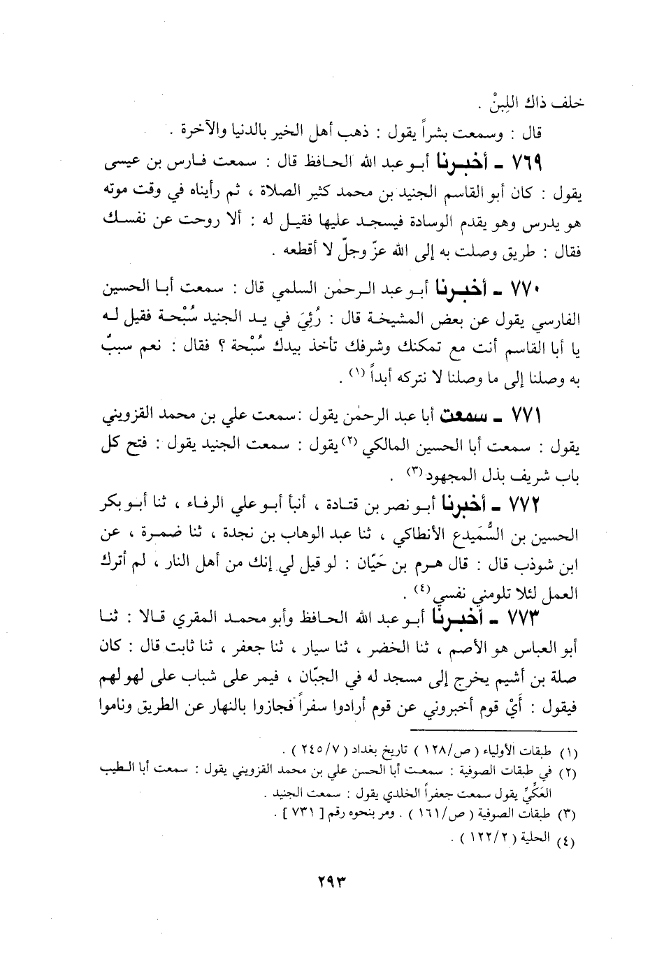 770 - أَخْبَرَنَا أَبُو عَبْدِ الرَّحْمَنِ السُّلَمِيُّ قَالَ: سَمِعْتُ أَبَا الْحُسَيْنِ الْفَارِسِيَّ، يَقُولُ عَنْ بَعْضِ الْمَشْيَخَةِ قَالَ: رُئِيَ فِي يَدِ الْجُنَيْدِ سُبْحَةٌ فَقِيلَ لَهُ: يَا أَبَا الْقَاسِمِ §أَنْتَ مَعَ تَمَكُّنِكَ وَشَرَفِكَ تَأْخُذُ بِيَدِكَ سُبْحَةً؟ فَقَالَ: «نَعَمْ سَبَبٌ بِهِ وَصَلْنَا إِلَى مَا وَصَلْنَا لَا نَتْرُكُهُ أَبَدًا»