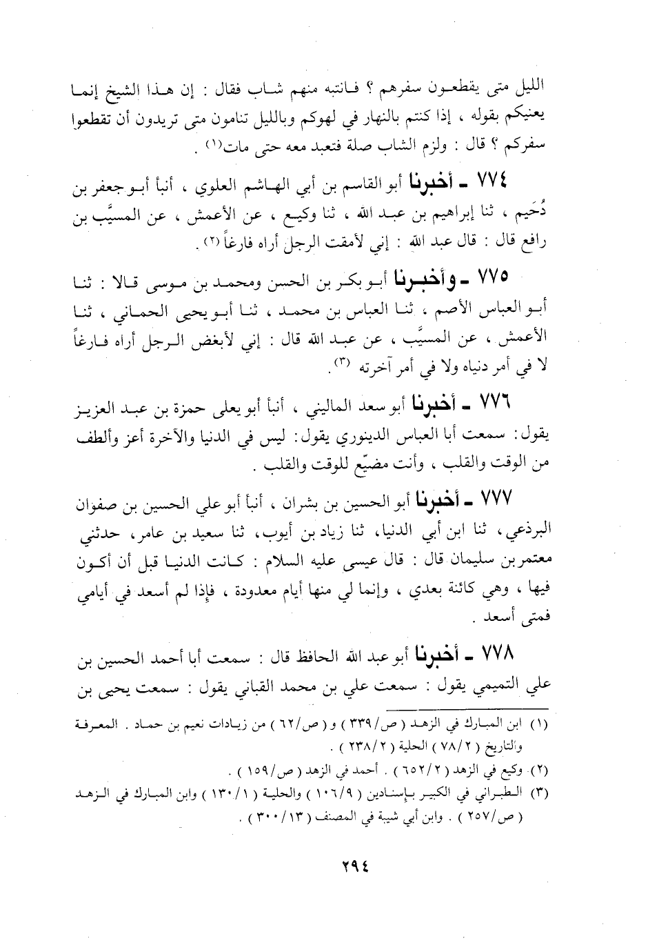 775 - وَأَخْبَرَنَا أَبُو بَكْرِ بْنُ الْحَسَنِ، وَمُحَمَّدُ بْنُ مُوسَى، قَالَا: ثنا أَبُو الْعَبَّاسِ الْأَصَمُّ، ثنا الْعَبَّاسُ بْنُ مُحَمَّدٍ، ثنا أَبُو يَحْيَى الْحِمَّانِيُّ، ثنا الْأَعْمَشُ، عَنِ الْمُسَيَّبِ، عَنْ عَبْدِ اللَّهِ رَضِىَ اللَّهُ عَنْهُ قَالَ: §«إِنِّي لَأَبْغَضُ الرَّجُلَ أَرَاهُ فَارِغًا لَا فِي أَمْرِ دُنْيَاهُ وَلَا فِي أَمْرِ آخِرَتِهِ»