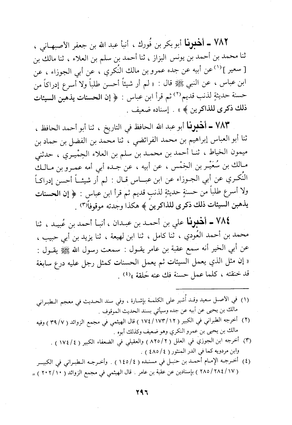 782 - أَخْبَرَنَا أَبُو بَكْرِ بْنُ فُورَكٍ، أَنْبَأَنَا عَبْدُ اللَّهِ بْنُ جَعْفَرٍ الْأَصْبَهَانِيُّ، ثنا مُحَمَّدُ بْنُ أَحْمَدَ بْنِ يُونُسَ الْبَزَّازُ، ثنا أَحْمَدُ بْنُ سَلَمَةَ بْنِ الْعَلَاءِ، ثنا مَالِكُ بْنُ سُعَيْرٍ، عَنْ أَبِيهِ، عَنْ جَدِّهِ عَمْرِو بْنِ مَالِكٍ النُكْرِيِّ عَنْ أَبِي الْجَوْزَاءِ، عَنِ ابْنِ عَبَّاسٍ رَضِيَ اللَّهُ عَنْهُمَا قَالَ: §«لَمْ أَرَ شَيْئًا أَحْسَنَ طَلَبًا وَلَا أَسْرَعَ إِدْرَاكًا مِنْ حَسَنَةٍ حَدِيثَةٍ لِذَنْبٍ قَدِيمٍ» ثُمَّ قَرَأَ ابْنُ عَبَّاسٍ رَضِيَ اللَّهُ عَنْهُمَا: {إِنَّ الْحَسَنَاتِ يُذْهِبْنَ السَّيِّئَاتِ ذَلِكَ ذِكْرَى لِلذَّاكِرِينَ} [هود: 114] " إِسْنَادُهُ ضَعِيفٌ