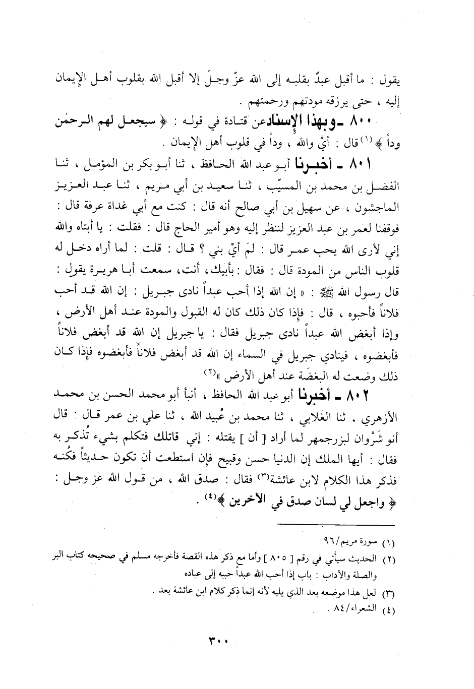801 - أَخْبَرَنَا أَبُو عَبْدِ اللَّهِ الْحَافِظُ، ثنا أَبُو بَكْرِ بْنُ الْمُؤَمَّلِ، ثنا الْفَضْلُ بْنُ مُحَمَّدِ بْنِ الْمُسَيَّبِ، ثنا سَعِيدُ بْنُ أَبِي مَرْيَمَ، ثنا عَبْدُ الْعَزِيزِ الْمَاجِشُونَ، عَنْ سُهَيْلِ بْنِ أَبِي صَالِحٍ، أَنَّهُ قَالَ: كُنْتُ مَعَ أَبِي غَدَاةَ عَرَفَةَ قَالَ: فَوَقَفْنَا لِعُمَرَ بْنِ عَبْدِ الْعَزِيزِ لِنَنْظُرَ إِلَيْهِ وَهُوَ أَمِيرُ الْحَاجِّ قَالَ: فَقُلْتُ: يَا أَبَتَاهُ وَاللَّهِ إِنِّي لَأَرَى اللَّهَ يُحِبُّ عُمَرَ قَالَ: لِمَ أَيْ بُنَيَّ؟ قَالَ: فَقُلْتُ: لِمَا أَرَاهُ دَخَلَ لَهُ قُلُوبَ النَّاسِ مِنَ الْمَوَدَّةِ قَالَ: فَقَالَ: بِأَبِيكَ، أَنْتَ: سَمِعْتُ أَبَا هُرَيْرَةَ يَقُولُ: قَالَ رَسُولُ اللَّهِ صَلَّى اللهُ عَلَيْهِ وَسَلَّمَ: §" إِنَّ اللَّهَ إِذَا أَحَبَّ عَبْدًا نَادَى جَبْرَائِيلَ إِنَّ اللَّهَ أَحَبَّ فَلَانًا فَأَحِبُّوهُ قَالَ: فَإِذَا كَانَ ذَلِكَ، كَانَ لَهُ الْقُبُولُ وَالْمَوَدَّةُ عِنْدَ أَهْلِ الْأَرْضِ، وَإِذَا أَبْغَضَ اللَّهُ عَبْدًا نَادَى جَبْرَائِيلَ، فَقَالَ: يَا جَبْرَائِيلُ إِنَّ اللَّهَ قَدِ أَبْغَضَ فَلَانًا، فَأَبْغِضُوهُ فَيُنَادِي جَبْرَائِيلُ فِي السَّمَاءِ: إِنَّ اللَّهَ قَدِ أَبْغَضَ فَلَانًا فَأَبْغِضُوهُ، فَإِذَا كَانَ ذَلِكَ وُضِعَتْ لَهُ الْبُغْضَةُ عِنْدَ أَهْلِ الْأَرْضِ "