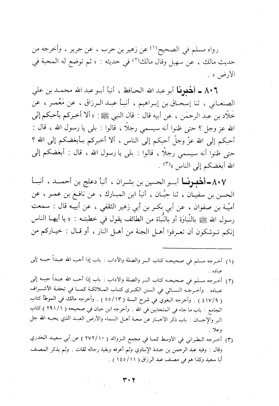 806 - أَخْبَرَنَا أَبُو عَبْدِ اللَّهِ الْحَافِظُ، أَنْبَأَنَا أَبُو عَبْدِ اللَّهِ مُحَمَّدُ بْنُ عَلِيٍّ الصَّنْعَانِيُّ، ثنا إِسْحَاقُ بْنُ إِبْرَاهِيمَ، أَنْبَأَنَا عَبْدُ الرَّزَّاقِ، عَنْ مَعْمَرٍ، عَنْ خَلَّادِ بْنِ عَبْدِ الرَّحْمَنِ، عَنْ أَبِيهِ قَالَ: قَالَ النَّبِيُّ صَلَّى اللهُ عَلَيْهِ وَسَلَّمَ: §«أَلَا أُخْبِرُكُمْ بِأَحَبِّكُمْ إِلَى اللَّهِ عَزَّ وَجَلَّ حَتَّى ظَنُّوا أَنَّهُ سَيُسَمِّي رَجُلًا» قَالُوا: بَلَى يَا رَسُولَ اللَّهِ قَالَ: «أَحَبُّكُمْ إِلَى اللَّهِ عَزَّ وَجَلَّ أَحَبُّكُمْ إِلَى النَّاسِ، أَلَا أُخْبِرُكُمْ بِأَبْغَضِكُمْ إِلَى اللَّهِ، حَتَّى ظَنُّوا أَنَّهُ سَيُسَمِي رَجُلًا» قَالُوا: بَلَى يَا رَسُولَ اللَّهِ قَالَ: «أَبْغَضُكُمْ إِلَى اللَّهِ أَبْغَضُكُمْ إِلَى النَّاسِ»