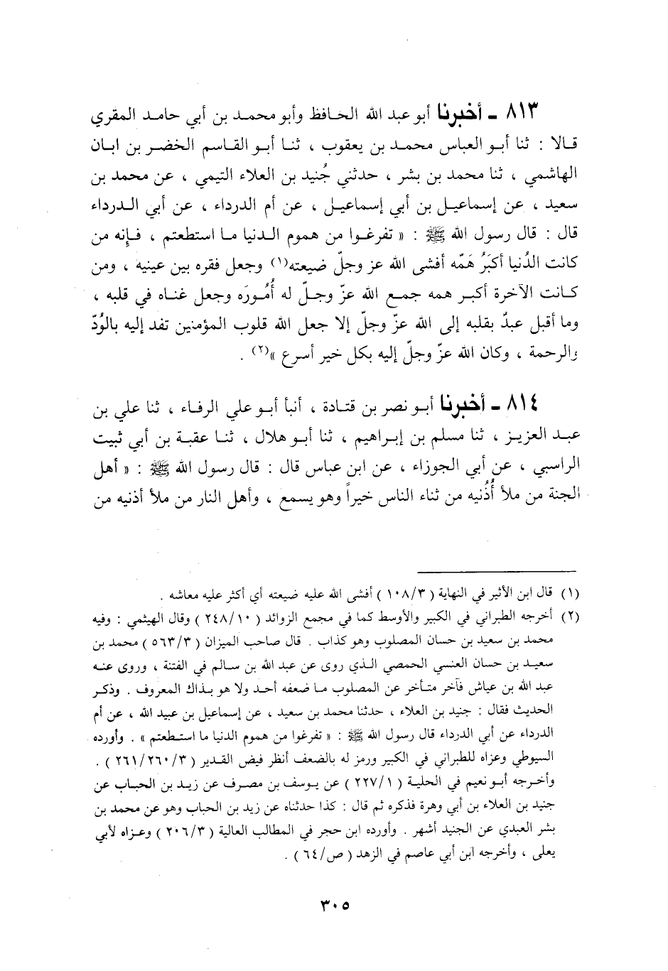 813 - أَخْبَرَنَا أَبُو عَبْدِ اللَّهِ الْحَافِظُ، وَأَبُو مُحَمَّدِ بْنُ أَبِي حَامِدٍ الْمُقْرِئُ قَالَا: ثنا أَبُو الْعَبَّاسِ مُحَمَّدُ بْنُ يَعْقُوبَ، ثنا أَبُو الْقَاسِمِ الْخَضِرُ بْنُ أَبَانَ الْهَاشِمِيُّ، ثنا مُحَمَّدُ بْنُ بِشْرٍ، حَدَّثَنِي جُنَيْدُ بْنُ الْعَلَاءِ التَّيْمِيُّ، عَنْ مُحَمَّدِ بْنِ سَعِيدٍ، عَنْ إِسْمَاعِيلَ بْنِ أَبِي إِسْمَاعِيلَ، عَنْ أُمِّ الدَّرْدَاءِ، عَنْ أَبِي الدَّرْدَاءِ قَالَ: قَالَ رَسُولُ اللَّهِ صَلَّى اللهُ عَلَيْهِ وَسَلَّمَ: «§تَفَرَّغُوا مِنْ هُمُومِ الدُّنْيَا مَا اسْتَطَعْتُمْ، فَإِنَّهُ مَنْ كَانَتِ الدُّنْيَا أَكْبَرَ هَمِّهِ أَفْشَى اللَّهُ عَزَّ وَجَلَّ ضَيْعَتَهُ وَجَعَلَ فَقَرَهُ بَيْنَ عَيْنَيْهِ، وَمَنْ كَانَتِ الْآخِرَةُ أَكْبَرَ هَمِّهِ جَمَعَ اللَّهُ عَزَّ وَجَلَّ لَهُ أَمُورَهُ وَجَعَلَ غِنَاهُ فِي قَلْبِهِ، وَمَا أَقْبَلَ عَبْدٌ بِقَلْبِهِ إِلَى اللَّهِ عَزَّ وَجَلَّ إِلَّا جَعَلَ اللَّهُ قُلُوبَ الْمُؤْمِنِينَ تَفِدُ إِلَيْهِ بِالْوُدِّ وَالرَّحْمَةِ وَكَانَ اللَّهُ إِلَيْهِ بِكُلِّ خَيْرٍ أَسْرَعَ»