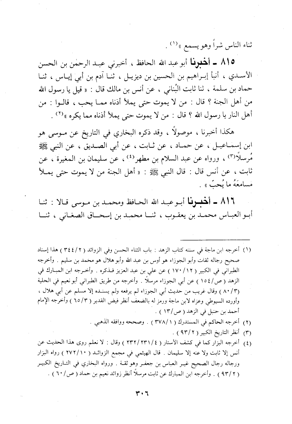 815 - أَخْبَرَنَا أَبُو عَبْدِ اللَّهِ الْحَافِظُ، أَخْبَرَنِي عَبْدُ الرَّحْمَنِ بْنُ الْحَسَنِ الْأَسَدِيُّ، أَنْبَأَنَا إِبْرَاهِيمُ بْنُ الْحُسَيْنِ بْنِ دِيزِيلَ، ثنا آدَمُ بْنُ أَبِي إِيَاسَ، ثنا حَمَّادُ بْنُ سَلَمَةَ، ثنا ثَابِتٌ الْبُنَانِيُّ، عَنْ أَنَسِ بْنِ مَالِكٍ رَضِيَ اللَّهُ عَنْهُ قَالَ: قِيلَ: يَا رَسُولَ اللَّهِ §مَنْ أَهْلُ الْجَنَّةِ؟ قَالَ: «مَنْ لَا يَمُوتُ حَتَّى يَمْلَأَ أُذُنَاهُ مِمَّا يُحِبُّ» ، قَالُوا: مَنْ أَهْلُ النَّارِ يَا رَسُولَ اللَّهِ؟ قَالَ: مَنْ لَا يَمُوتُ حَتَّى يَمْلَأَ أُذُنَاهُ مِمَّا يَكْرَهُ " هَكَذَا أَخْبَرَنَا، مَوْصُولًا، وَقَدْ ذَكَرَهُ الْبُخَارِيُّ فِي التَّارِيخِ عَنْ مُوسَى هُوَ ابْنُ إِسْمَاعِيلَ عَنْ حَمَّادٍ عَنْ ثَابِتٍ عَنْ أَبِي الصِّدِّيقِ عَنِ النَّبِيِّ صَلَّى اللهُ عَلَيْهِ وَسَلَّمَ مُرْسَلًا
