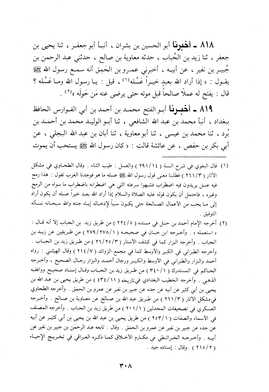 818 - أَخْبَرَنَا أَبُو الْحُسَيْنِ بْنُ بِشْرَانَ، أَنْبَأَنَا أَبُو جَعْفَرٍ، ثنا يَحْيَى بْنُ جَعْفَرٍ، ثنا زَيْدُ بْنُ الْحُبَابِ، حَدَّثَنِي مُعَاوِيَةُ بْنُ صَالِحٍ، حَدَّثَنِي عَبْدُ الرَّحْمَنِ بْنُ جُبَيْرِ بْنِ نُفَيْرٍ، عَنْ أَبِيهِ، أَخْبَرَنِي عَمْرُو بْنُ الْحَمِقِ رَضِيَ اللَّهُ عَنْهُ أَنَّهُ سَمِعَ رَسُولَ اللَّهِ صَلَّى اللهُ عَلَيْهِ وَسَلَّمَ يَقُولُ: «§إِذَا أَرَادَ اللَّهُ بِعَبْدٍ خَيْرًا عَسَّلَهُ» قِيلَ: يَا رَسُولَ اللَّهِ وَمَا عَسَّلَهُ؟ قَالَ: «يَفْتَحُ لَهُ عَمَلًا صَالِحًا قَبْلَ مَوْتِهِ حَتَّى يَرْضَى عَنْهُ مَنْ حَوْلَهُ»
