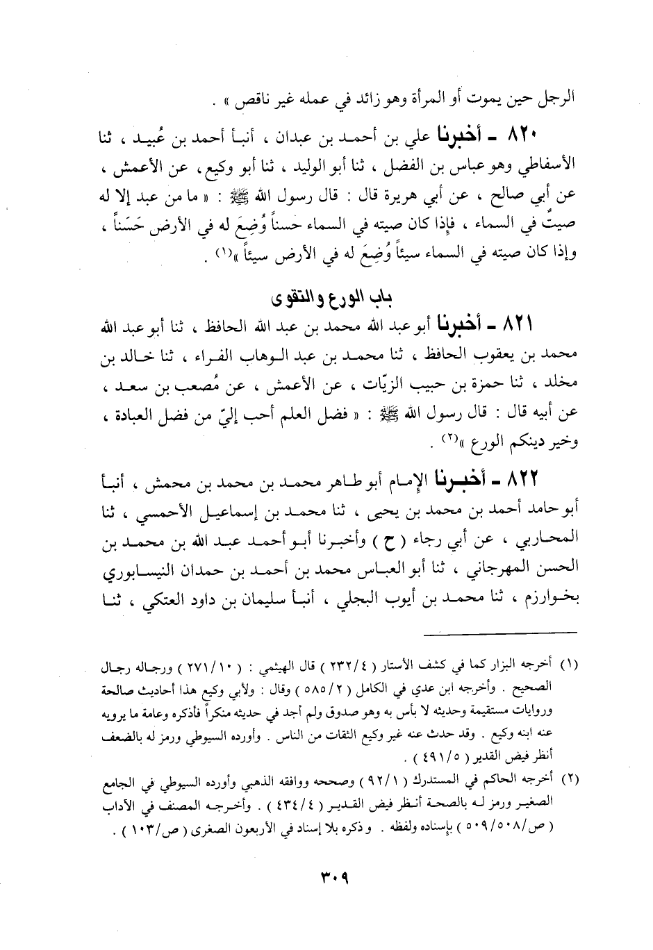 821 - أَخْبَرَنَا أَبُو عَبْدِ اللَّهِ مُحَمَّدُ بْنُ عَبْدِ اللَّهِ الْحَافِظُ، ثنا أَبُو عَبْدِ اللَّهِ مُحَمَّدُ بْنُ يَعْقُوبَ الْحَافِظُ، ثنا مُحَمَّدُ بْنُ عَبْدِ الْوَهَّابِ الْفَرَّاءُ، أَنْبَأَنَا خَالِدُ بْنُ مُخَلَّدٍ، ثنا حَمْزَةُ بْنُ حَبِيبٍ الزَّيَّاتُ، عَنِ الْأَعْمَشِ، عَنْ مُصْعَبِ بْنِ سَعْدٍ، عَنْ أَبِيهِ رَضِيَ اللَّهُ عَنْهُ قَالَ: قَالَ رَسُولُ اللَّهِ صَلَّى اللهُ عَلَيْهِ وَسَلَّمَ: «§فَضْلُ الْعِلْمِ أَحَبُّ إِلَيَّ مِنْ فَضْلِ الْعِبَادَةِ، وَخَيْرُ دِينِكُمُ الْوَرَعُ»