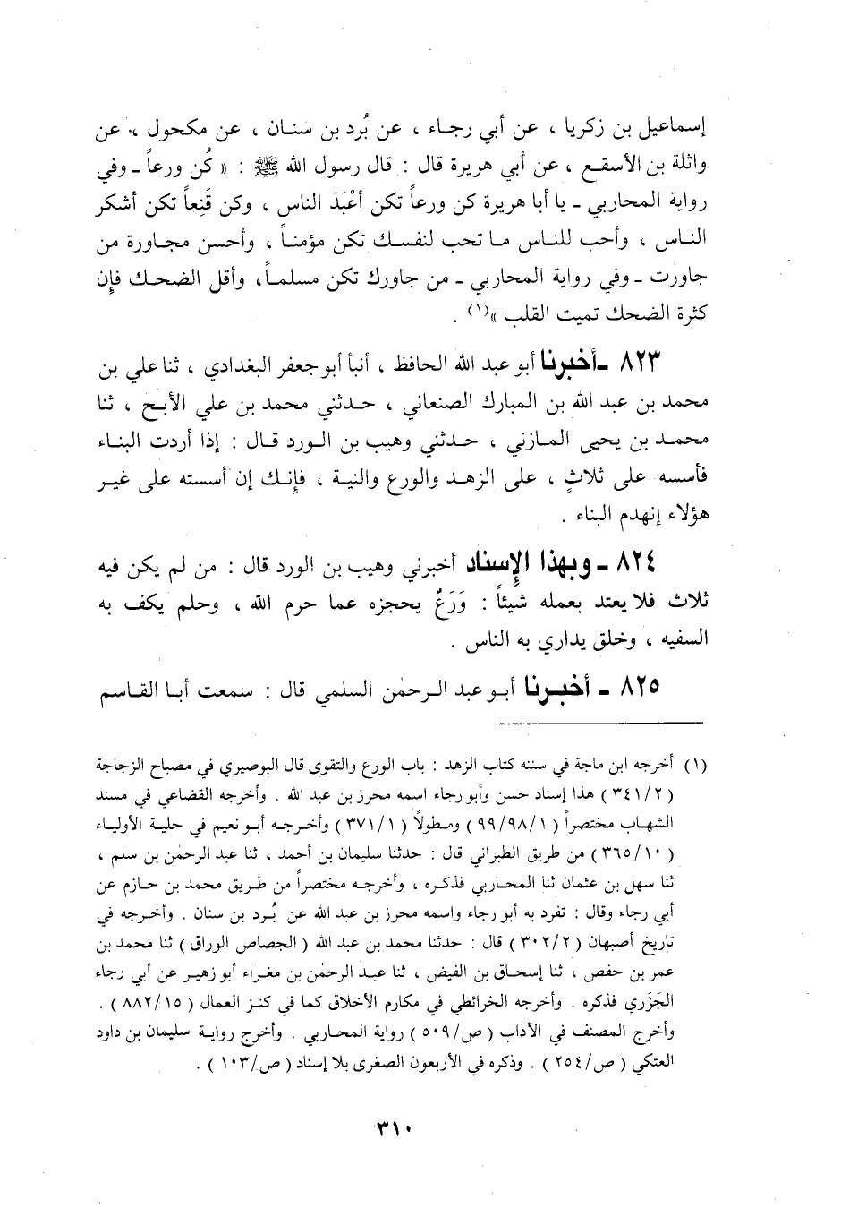 823 - أَخْبَرَنَا أَبُو عَبْدِ اللَّهِ الْحَافِظُ، أَنْبَأَنَا أَبُو جَعْفَرٍ الْبَغْدَادِيُّ، ثنا عَلِيُّ بْنُ مُحَمَّدِ بْنِ عَبْدِ اللَّهِ بْنِ الْمُبَارَكِ الصَّنْعَانِيُّ، حَدَّثَنِي مُحَمَّدُ بْنُ عَلِيٍّ الْأَبَحُّ، ثنا مُحَمَّدُ بْنُ يَحْيَى الْمَأْرَبِيُّ، حَدَّثَنِي وُهَيْبُ بْنُ الْوَرْدِ قَالَ: " §إِذَا أَرَدْتَ الْبِنَاءَ فَأَسِّسْهُ عَلَى ثَلَاثٍ: عَلَى الزُّهْدِ، وَالْوَرَعِ، وَالنِّيَةِ، فَإِنَّكَ إِنْ أَسَّسْتَهُ عَلَى غَيْرِ هَؤُلَاءِ انْهَدَمَ الْبِنَاءُ "