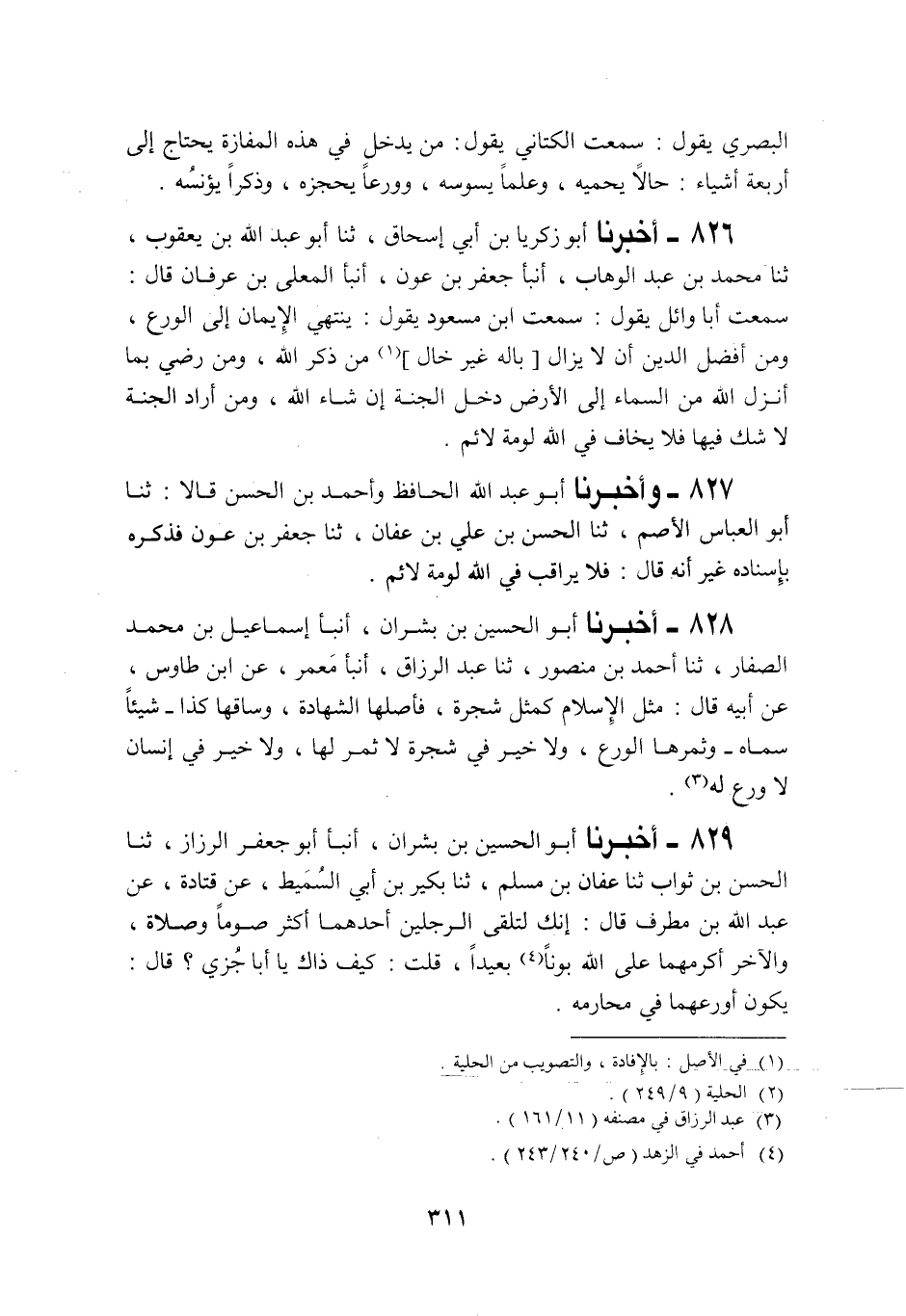 826 - أَخْبَرَنَا أَبُو زَكَرِيَّا بْنُ أَبِي إِسْحَاقَ، ثنا أَبُو عَبْدِ اللَّهِ بْنُ يَعْقُوبَ، ثنا مُحَمَّدُ بْنُ عَبْدِ الْوَهَّابِ، أَنْبَأَنَا جَعْفَرُ بْنُ عَوْنٍ، أَنْبَأَنَا الْمُعَلَّى بْنُ عِرْفَانَ قَالَ: سَمِعْتُ أَبَا وَائِلٍ يَقُولُ: سَمِعْتُ ابْنَ مَسْعُودٍ رَضِيَ اللَّهُ عَنْهُ يَقُولُ: «§يَنْتَهِي الْإِيمَانُ إِلَى الْوَرَعِ، وَمِنْ أَفْضَلِ الدِّينِ أَنْ لَا يَزَالَ بِالْإِفَادَةِ مِنْ ذِكْرِ اللَّهِ وَمَنْ رَضِيَ بِمَا أَنْزَلَ اللَّهُ مِنَ السَّمَاءِ إِلَى الْأَرْضِ دَخَلَ الْجَنَّةَ إِنْ شَاءَ اللَّهُ، وَمَنْ أَرَادَ الْجَنَّةَ لَا شَكَّ فِيهَا فَلَا يَخَافُ فِي اللَّهِ لَوْمَةَ لَائِمٍ»