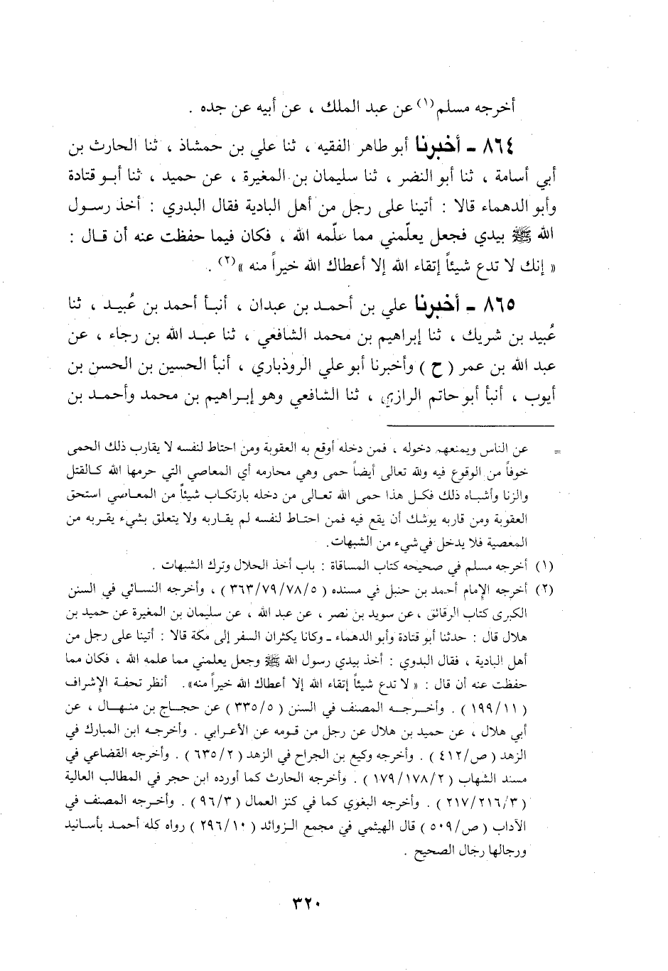 864 - أَخْبَرَنَا أَبُو طَاهِرٍ الْفَقِيهُ، ثنا عَلِيُّ بْنُ حَمْشَاذٍ، ثنا الْحَارِثُ بْنُ أَبِي أُسَامَةَ، ثنا أَبُو النَّضْرِ، ثنا سُلَيْمَانُ بْنُ الْمُغِيرَةِ، عَنْ حُمَيْدٍ، ثنا أَبُو قَتَادَةَ، وَأَبُو الدَّهْمَاءِ، قَالَا: أَتَيْنَا عَلَى رَجُلٍ مِنْ أَهْلِ الْبَادِيَةِ، فَقَالَ الْبَدَوِيُّ: أَخَذَ رَسُولُ اللَّهِ صَلَّى اللهُ عَلَيْهِ وَسَلَّمَ بِيَدِي، فَجَعَلَ يُعَلِّمُنِي مِمَّا عَلَّمَهُ اللَّهُ، فَكَانَ فِيمَا حَفِظْتُ عَنْهُ أَنْ قَالَ: §«إِنَّكَ لَا تَدَعُ شَيْئًا اتِّقَاءً لِلَّهِ إِلَّا أَعْطَاكَ اللَّهُ خَيْرًا مِنْهُ»