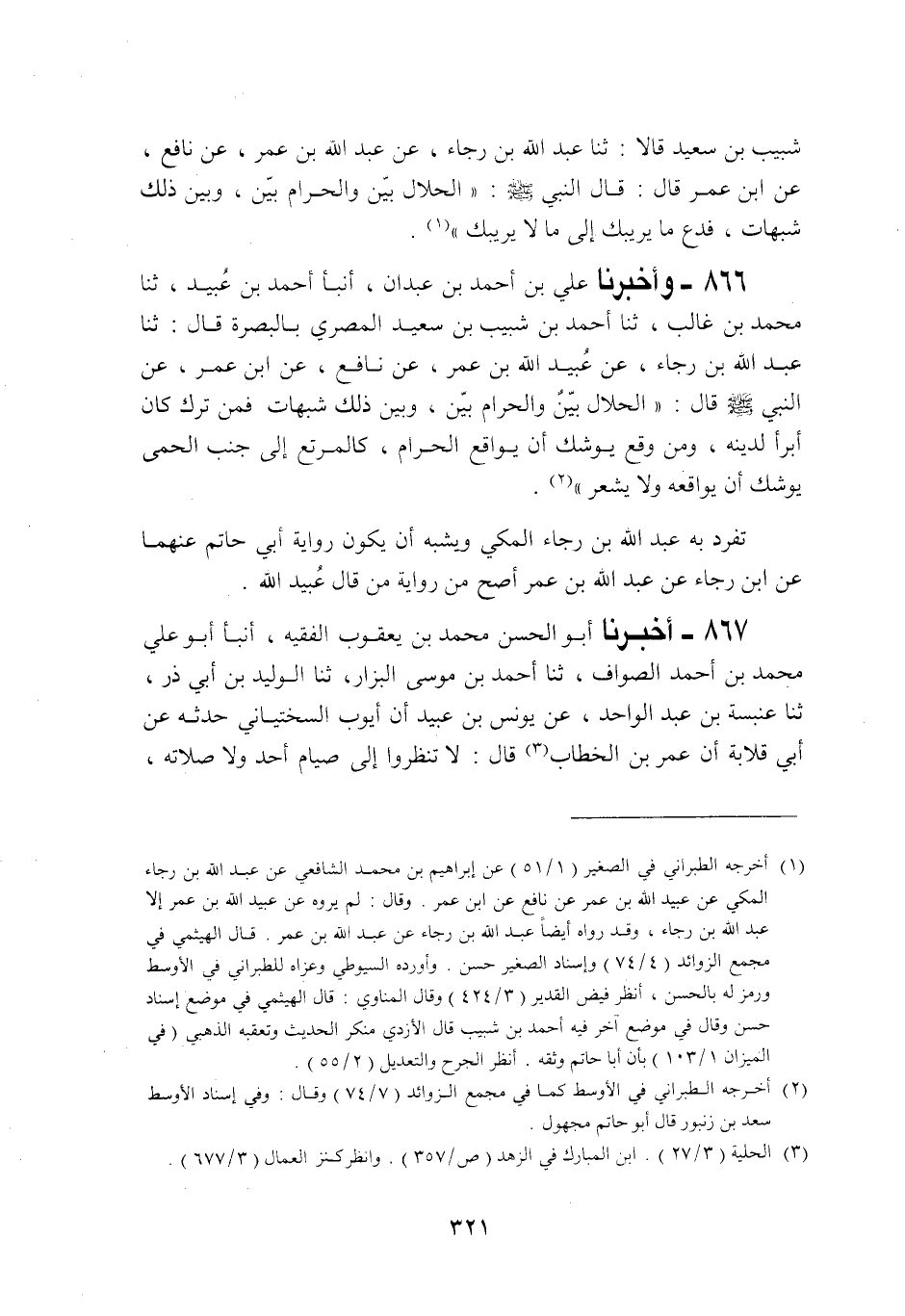 866 - وَأَخْبَرَنَا عَلِيُّ بْنُ أَحْمَدَ بْنِ عَبْدَانَ، أَنْبَأَنَا أَحْمَدُ بْنُ عُبَيْدٍ، ثنا مُحَمَّدُ بْنُ غَالِبٍ، ثنا أَحْمَدُ بْنُ شَبِيبِ بْنِ سَعِيدٍ الْمَقْبُرِيُّ، بِالْبَصْرَةِ قَالَ: ثنا عَبْدُ اللَّهِ بْنُ رَجَاءٍ، عَنْ عُبَيْدِ اللَّهِ بْنِ عُمَرَ، عَنْ نَافِعٍ، عَنِ ابْنِ عُمَرَ رَضِيَ اللَّهُ عَنْهُمَا عَنِ النَّبِيِّ صَلَّى اللهُ عَلَيْهِ وَسَلَّمَ قَالَ: «§الْحَلَالُ بَيِّنٌ وَالْحَرَامُ بَيِّنٌ، وَبَيْنَ ذَلِكَ شُبُهَاتٌ، فَمَنْ تَرَكَ كَانَ أَبْرَأَ لِدِينِهِ، وَمَنْ وَقَعَ يُوشِكُ أَنْ يُواقِعَ الْحَرَامَ كَالْمُرْتِعِ إِلَى جَنْبِ الْحِمَى يُوشِكُ أَنْ يُواقِعَهُ وَلَا يَشْعُرُ» تَفَرَّدَ بِهِ عَبْدُ اللَّهِ بْنُ رَجَاءٍ الْمَكِّيُّ يُشْبِهُ أَنْ تَكُونَ رِوَايَةُ أَبِي حَاتِمٍ عَنْهُمَا عَنِ ابْنِ رَجَاءِ عَنْ عَبْدِ اللَّهِ بْنِ عُمَرَ أَصَحَّ مِنْ رِوَايَةِ مَنْ قَالَ: عُبَيْدُ اللَّهِ "