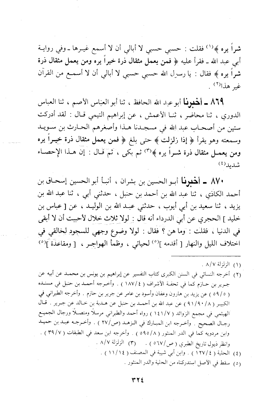 870 - أَنْبَأَنَا أَبُو عَبْدِ اللَّهِ الْحَافِظُ، أَنْبَأَنَا أَبُو عَبْدِ اللَّهِ مُحَمَّدُ بْنُ يَعْقُوبَ الْحَافِظُ، أَنْبَأَنَا إِبْرَاهِيمُ بْنُ عَبْدِ اللَّهِ السَّعْدِيُّ، ثنا وَهْبُ بْنُ جَرِيرٍ، ثنا أَبِي قَالَ: سَمِعْتُ الْحَسَنَ، يُحَدِّثُ عَنْ صَعْصَعَةَ عَمِّ الْفَرَزْدَقِ أَنَّهُ قَدِمَ عَلَى رَسُولِ اللَّهِ صَلَّى اللهُ عَلَيْهِ وَسَلَّمَ فَقَرَأَ عَلَيْهِ {§فَمَنَ يَعْمَلْ مِثْقَالَ ذَرَّةٍ خَيْرًا يَرَهُ وَمَنْ يَعْمَلْ مِثْقَالَ ذَرَّةْ شَرًّا يَرَهُ} [الزلزلة: 8] قَالَ: «حَسْبِي لَا أُبَالِي أَنْ أَسْمَعَ غَيْرَهَا»