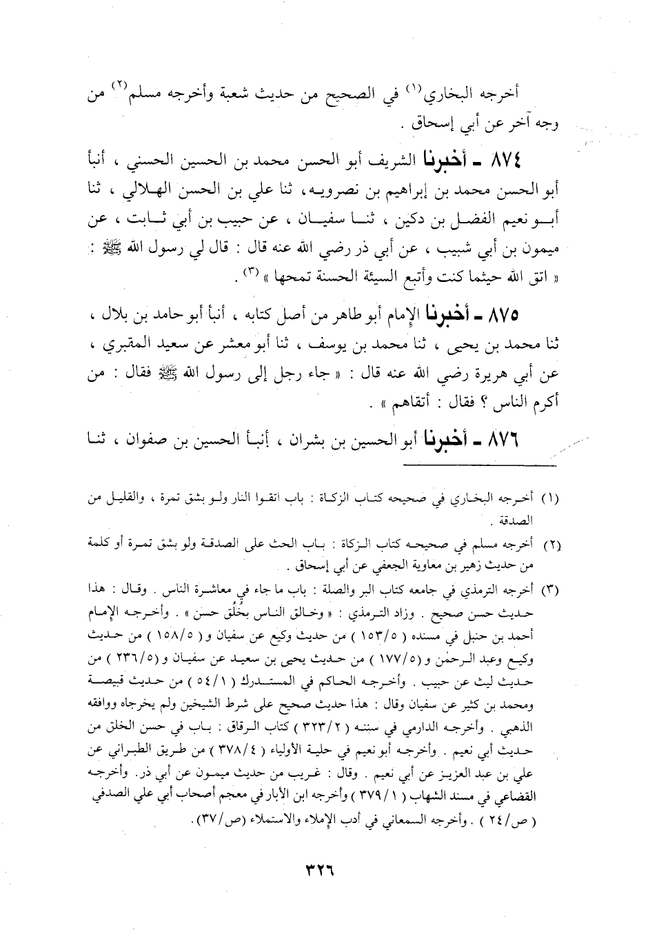 874 - أَخْبَرَنَا شَرِيفٌ أَبُو الْحَسَنِ مُحَمَّدُ بْنُ الْحُسَيْنِ الْحُسَنِيُّ، أَنْبَأَنَا أَبُو الْحَسَنِ مُحَمَّدُ بْنُ إِبْرَاهِيمَ بْنَ نَصْرَوَيْهِ، ثنا عَلِيُّ بْنُ الْحَسَنِ الْهِلَالُ، ثنا أَبُو نُعَيْمٍ الْفَضْلُ بْنُ دُكَيْنٍ، ثنا سُفْيَانُ، عَنْ حَبِيبِ بْنِ أَبِي ثَابِتٍ، عَنْ مَيْمُونِ بْنِ أَبِي شَبِيبٍ، عَنْ أَبِي ذَرٍّ رَضِيَ اللَّهُ عَنْهُ قَالَ: قَالَ لِي رَسُولُ اللَّهِ صَلَّى اللهُ عَلَيْهِ وَسَلَّمَ: «§اتَّقِ اللَّهَ حَيْثُمَا كُنْتَ، وَأَتْبِعِ السَّيِّئَةَ الْحَسَنَةَ تَمْحُهَا»