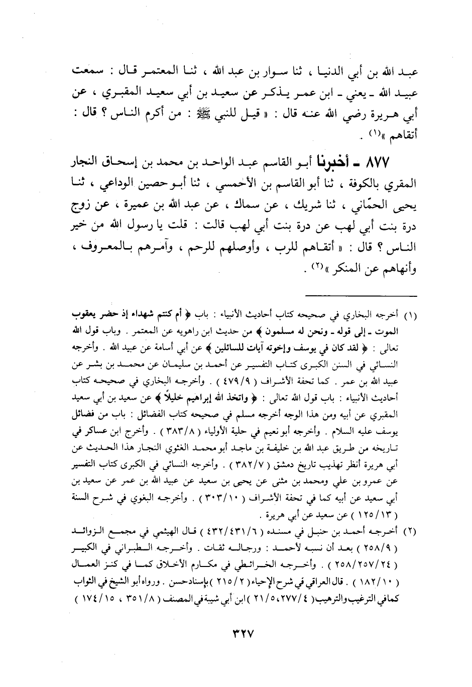 877 - أَخْبَرَنَا أَبُو الْقَاسِمِ عَبْدُ الْوَاحِدِ بْنُ مُحَمَّدِ بْنِ إِسْحَاقَ بْنِ النَّجَّارِ الْمُقْرِئُ بِالْكُوفَةِ، أَنْبَأَنَا أَبُو الْقَاسِمِ بْنُ الْأَحْمَسِي، ثنا أَبُو حُصَيْنِ الْوَادِعِيُّ، ثنا يَحْيَى الْحِمَّانِي، ثنا شَرِيكٌ، عَنْ سِمَاكٍ، عَنْ عَبْدِ اللَّهِ بْنِ عَمِيرَةَ، عَنْ زَوْجِ دُرَّةَ بِنْتِ أَبِي لَهَبٍ، عَنْ دُرَّةَ بِنْتِ أَبِي لَهَبٍ رَضِيَ اللَّهُ عَنْهَا، قَالَتْ: قُلْتُ: يَا رَسُولَ اللَّهِ، §مَنْ خَيْرُ النَّاسِ؟ قَالَ: «أَتْقَاهُمْ لِلرَّبِّ، وَأَوْصَلَهُمْ لِلرَّحِمِ، وَآمَرُهُمْ بِالْمَعْرُوفِ، وَأَنْهَاهُمْ عَنِ الْمُنْكَرِ»