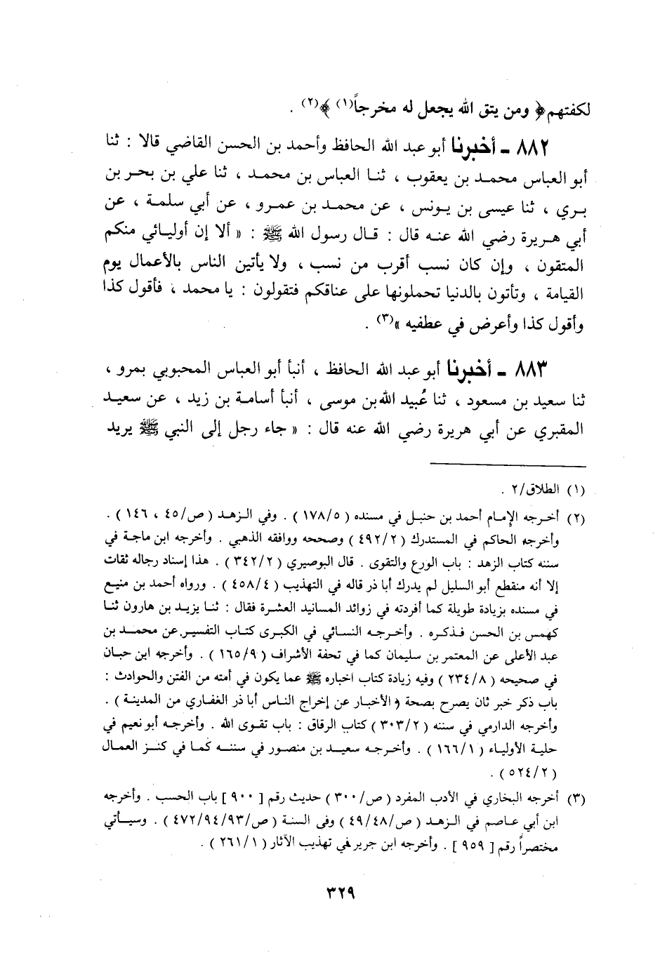 882 - أَخْبَرَنَا أَبُو عَبْدِ اللَّهِ الْحَافِظُ، وَأَحْمَدُ بْنُ الْحَسَنِ الْقَاضِي، قَالَا: ثنا أَبُو الْعَبَّاسِ مُحَمَّدُ بْنُ يَعْقُوبَ، ثنا الْعَبَّاسُ بْنُ مُحَمَّدٍ، ثنا عَلِيُّ بْنُ بَحْرِ بْنِ بَرِّيٍّ، ثنا عِيسَى بْنُ يُونُسَ، عَنْ مُحَمَّدِ بْنِ عَمْرٍو، عَنْ أَبِي سَلَمَةَ، عَنْ أَبِي هُرَيْرَةَ رَضِيَ اللَّهُ عَنْهُ قَالَ: قَالَ رَسُولُ اللَّهِ صَلَّى اللهُ عَلَيْهِ وَسَلَّمَ: §" أَلَا إِنَّ أَوْلِيَائِي مِنْكُمُ الْمُتَّقُونَ وَإِنْ كَانَ نَسَبٌ أَقْرَبَ مِنْ نَسَبٍ، وَلَا يَأْتِيَنَّ النَّاسُ بِالْأَعْمَالِ يَوْمَ الْقِيَامَةِ، وَتَأْتُونَ بِالدُّنْيَا تَحْمِلُونَهَا عَلَى أَعْنَاقِكُمْ فَتَقُولُونَ: يَا مُحَمَّدُ فَأَقُولُ كَذَا وَأَقُولُ كَذَا وَأَعْرَضَ فِي عَطْفَيْهِ "
