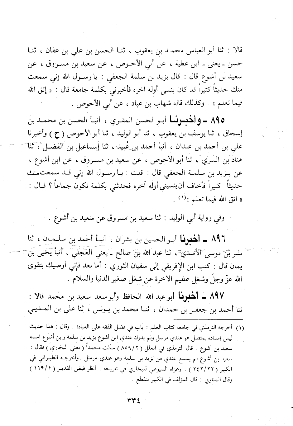 895 - وَأَخْبَرَنَا أَبُو الْحَسَنِ الْمُقْرِئُ، أَنْبَأَنَا الْحَسَنُ بْنُ مُحَمَّدِ بْنِ إِسْحَاقَ، ثنا يُوسُفُ بْنُ يَعْقُوبَ، ثنا أَبُو الْوَلِيدِ، ثنا أَبُو الْأَحْوَصِ، ح، وَأَخْبَرَنَا عَلِيُّ بْنُ أَحْمَدَ بْنِ عَبْدَانَ، أَنْبَأَنَا أَحْمَدُ بْنُ عُبَيْدٍ، ثنا إِسْمَاعِيلُ بْنُ الْفَضْلِ، ثنا هَنَّادُ بْنُ السَّرِيِّ، ثنا أَبُو الْأَحْوَصِ، عَنْ سَعِيدِ بْنِ مَسْرُوقٍ، عَنِ ابْنِ أَشْوَعَ، عَنْ يَزِيدَ بْنِ سَلَمَةَ الْجُعْفِيِّ قَالَ: قُلْتُ: يَا رَسُولَ اللَّهِ إِنِّي قَدْ سَمِعْتُ مِنْكَ حَدِيثًا كَثِيرًا، فَأَخَافُ أَنْ يُنْسِيَنِي أَوَّلُهُ آخِرَهُ، فَحَدَّثَنِي بِكَلِمَةٍ تَكُونُ جِمَاعًا قَالَ: «§اتَّقِ اللَّهَ فِيمَا تَعْلَمَ» وَفِي رِوَايَةِ أَبِي الْوَلِيدِ، ثنا سَعِيدُ بْنُ مَسْرُوقٍ عَنْ سَعِيدِ بْنِ أَشْوَعَ