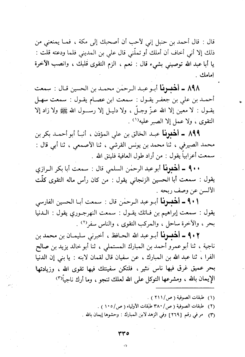 900 - أَخْبَرَنَا أَبُو عَبْدِ الرَّحْمَنِ السُّلَمِيُّ قَالَ: سَمِعْتُ أَبَا بَكْرٍ الرَّازِيَّ يَقُولُ: سَمِعْتُ أَبَا الْحُسَيْنِ الزِّنْجَانِيَّ يَقُولُ: §«مَنْ كَانَ رَأْسُ مَالِهِ التَّقْوَى كَلَّتِ الْأَلْسُنُ عَنْ وَصْفِ رِبْحِهِ»