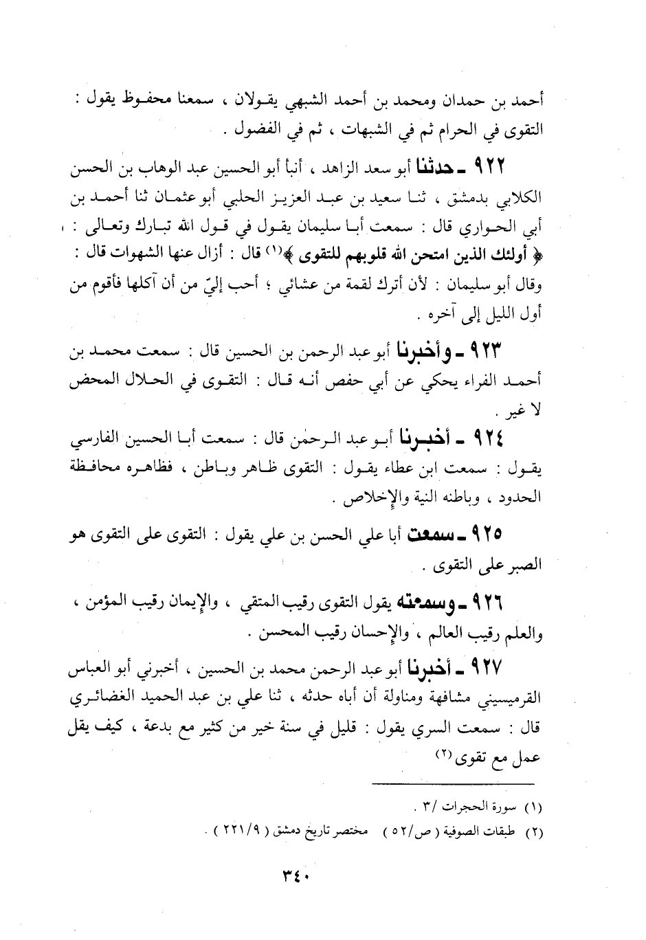 922 - حَدَّثَنَا أَبُو سَعْدٍ الزَّاهِدُ، أَنْبَأَنَا أَبُو الْحُسَيْنِ عَبْدُ الْوَهَّابِ بْنُ الْحَسَنِ الْكِلَابِيُّ، بِدِمَشْقَ، ثنا سَعِيدُ بْنُ عَبْدِ الْعَزِيزِ الْحَلَبِيُّ أَبُو عُثْمَانَ، ثنا أَحْمَدُ بْنُ أَبِي الْحَوَارِيِّ قَالَ: سَمِعْتُ أَبَا سُلَيْمَانَ يَقُولُ فِي قَوْلِ اللَّهِ تَبَارَكَ وَتَعَالَى: {§أُولَئِكَ الَّذِينَ امْتَحَنَ اللَّهُ قُلُوبَهُمْ لِلتَّقْوَى} [الحجرات: 3] قَالَ: " أَزَالَ عَنْهَا الشَّهَوَاتِ، قَالَ: قَالَ أَبُو سُلَيْمَانَ: لَأَنْ أَتْرُكَ لُقْمَةً مِنْ عَشَائِي أَحَبُّ إِلَيَّ مِنْ أَنْ آكُلَهَا، فَأَقُومُ مِنْ أَوَّلِ اللَّيْلِ إِلَى آخِرِهِ "