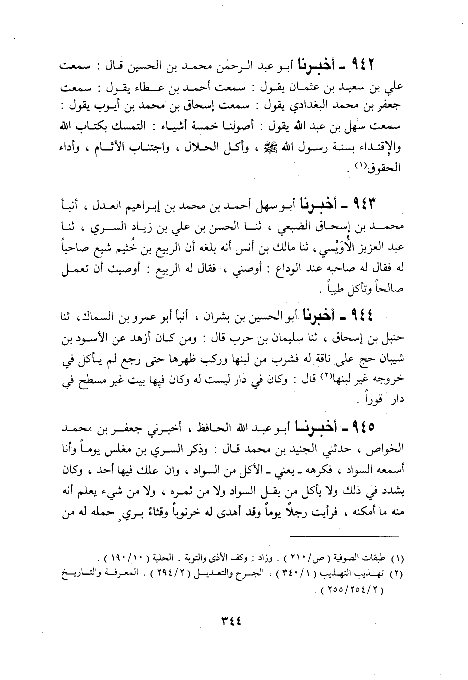 942 - أَخْبَرَنَا أَبُو عَبْدِ الرَّحْمَنِ مُحَمَّدُ بْنُ الْحُسَيْنِ قَالَ: سَمِعْتُ عَلِيَّ بْنَ سَعِيدِ بْنِ عُثْمَانَ يَقُولُ: سَمِعْتُ أَحْمَدَ بْنَ عَطَاءٍ يَقُولُ: سَمِعْتُ جَعْفَرَ بْنَ مُحَمَّدٍ الْبَغْدَادِيَّ يَقُولُ: سَمِعْتُ إِسْحَاقَ بْنَ مُحَمَّدِ بْنِ أَيُّوبَ يَقُولُ: سَمِعْتُ سَهْلَ بْنَ عَبْدِ اللَّهِ يَقُولُ: " §أُصُولُنَا خَمْسَةُ أَشْيَاءٍ: التَّمَسُّكُ بِكِتَابِ اللَّهِ، وَالِاقْتِدَاءُ بِسُنَّةِ رَسُولِ اللَّهُ صَلَّى اللهُ عَلَيْهِ وَسَلَّمَ، وَأَكْلُ الْحَلَالِ، وَاجْتِنَابُ الْآثَامِ، وَأَدَاءُ الْحُقُوقِ "