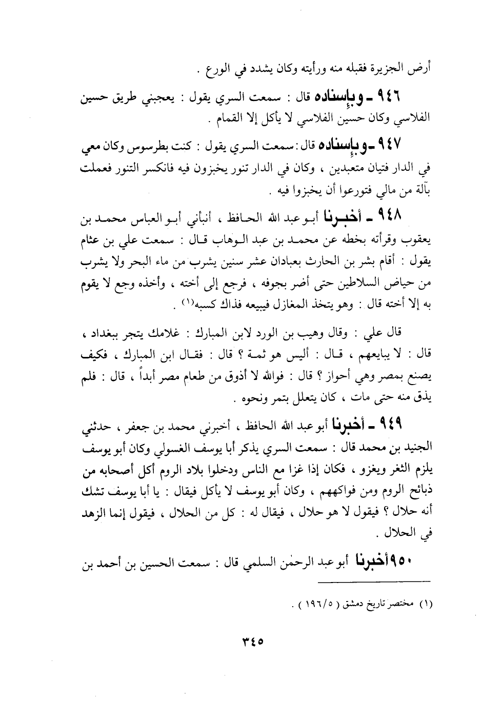 949 - أَخْبَرَنَا أَبُو عَبْدِ اللَّهِ الْحَافِظُ، أَخْبَرَنِي جَعْفَرِ بْنُ مُحَمَّدُ، حَدَّثَنِي الْجُنَيْدُ بْنُ مُحَمَّدٍ قَالَ: سَمِعْتُ السَّرِيَّ، يَذْكُرُ أَبَا يُوسُفَ الْغَسُولِيَّ، وَكَانَ أَبُو يُوسُفَ يَلْزَمُ الثَّغْرَ وَيَغْزُو، فَكَانَ إِذَا غَزَا مَعَ النَّاسِ وَدَخَلُوا بِلَادَ الرُّومِ أَكَلَ أَصْحَابُهُ مِنْ ذَبَائِحِ الرُّومِ وَمِنْ فَوَاكِهِهِمْ، وَكَانَ أَبُو يُوسُفَ لَا يَأْكُلُ فَيُقَالُ لَهُ: §" يَا أَبَا يُوسُفَ تَشُكُّ أَنَّهُ حَلَالٌ؟ فَيَقُولُ لَا هُوَ حَلَالٌ، فَيُقَالُ لَهُ: كُلْ مِنَ الْحَلَالِ، فَيَقُولُ إِنَّمَا الزُّهْدُ فِي الْحَلَالِ "