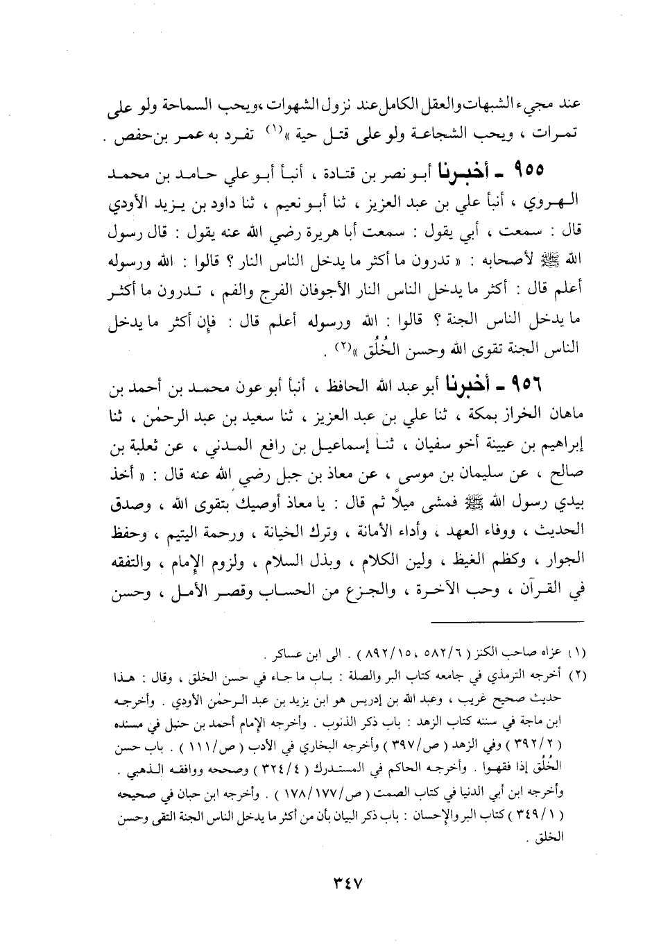 955 - أَخْبَرَنَا أَبُو نَصْرِ بْنُ قَتَادَةَ، أَنْبَأَنَا أَبُو عَلِيِّ حَامِدُ بْنُ مُحَمَّدٍ الْهَرَوِيُّ، أَنْبَأَنَا أَبُو نُعَيْمٍ، ثنا دَاوُدُ بْنُ يَزِيدَ الْأَوْدِيُّ قَالَ: سَمِعْتُ أَبِي يَقُولُ: سَمِعْتُ أَبَا هُرَيْرَةَ يَقُولُ: قَالَ رَسُولُ اللَّهِ صَلَّى اللهُ عَلَيْهِ وَسَلَّمَ لِأَصْحَابِهِ: §«تَدْرُونَ مَا أَكْثَرُ مَا يُدْخِلُ النَّاسَ النَّارَ؟» قَالُوا اللَّهُ وَرَسُولُهُ أَعْلَمُ قَالَ: «أَكْثَرُ مَا يُدْخِلُ النَّاسَ النَّارَ الْأَجْوَفَانِ، الْفَرْجُ وَالْفَمُّ، تَدْرُونَ مَا أَكْثَرُ مَا يُدْخِلُ النَّاسَ الْجَنَّةَ؟» قَالُوا: اللَّهُ وَرَسُولُهُ أَعْلَمُ قَالَ: «فَإِنَّ أَكْثَرَ مَا يُدْخِلُ النَّاسَ الْجَنَّةَ تَقْوَى اللَّهِ وَحُسْنُ الْخُلُقِ»