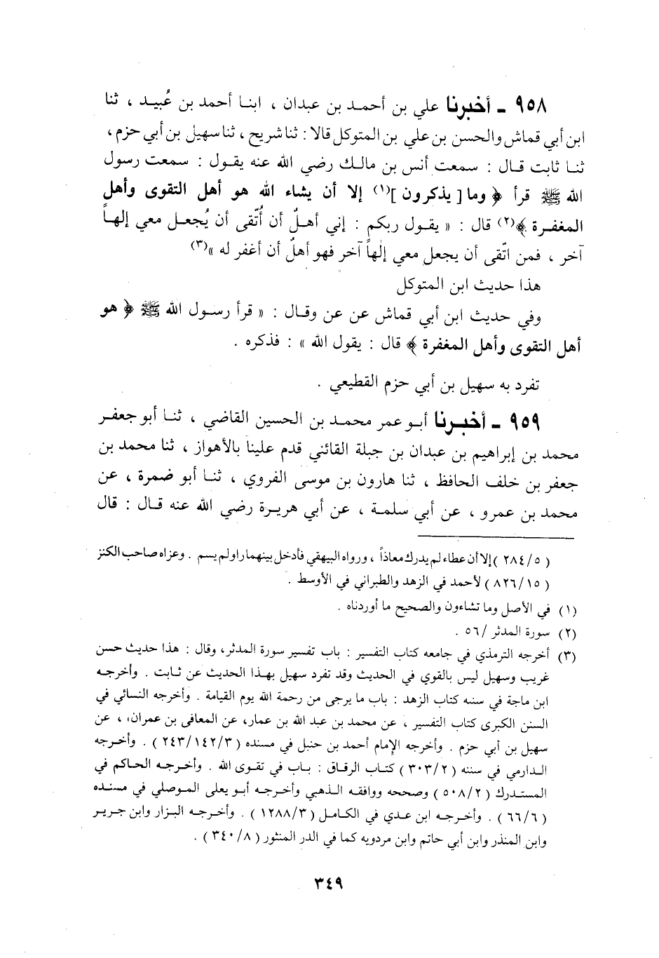 958 - أَخْبَرَنَا عَلِيُّ بْنُ أَحْمَدَ بْنِ عَبْدَانَ، أَنْبَأَنَا أَحْمَدُ بْنُ عُبَيْدٍ، ثنا ابْنُ أَبِي قِمَاشٍ، وَالْحَسَنُ بْنُ عَلِيِّ بْنِ الْمُتَوَكِّلِ، قَالَا: ثنا شُرَيْحٌ، ثنا سُهَيْلُ بْنُ أَبِي حَزْمٍ، ثنا ثَابِتٌ قَالَ: سَمِعْتُ أَنَسَ بْنَ مَالِكٍ يَقُولُ: سَمِعْتُ رَسُولَ اللَّهِ صَلَّى اللهُ عَلَيْهِ وَسَلَّمَ قَرَأَ: {وَمَا تَشَاءُونَ إِلَّا أَنْ يَشَاءَ اللَّهُ هُوَ أَهْلُ التَّقْوَى وَأَهْلُ الْمَغْفِرَةِ} قَالَ: يَقُولُ رَبُّكُمْ: §إِنِّي أَهْلٌ أَنْ أُتَّقَى أَنْ يُجْعَلَ مَعِي إِلَهًا آخَرَ، فَمَنِ اتَّقَى أَنْ يَجْعَلَ مَعِي إِلَهًا آخَرَ هُوَ أَهْلٌ أَنْ أَغْفِرَ لَهُ " هَذَا حَدِيثُ ابْنُ الْمُتَوَكِّلِ وَفِي حَدِيثِ ابْنِ أَبِي قِمَاشٍ قَالَ: قَرَأَ رَسُولُ اللَّهِ صَلَّى اللهُ عَلَيْهِ وَسَلَّمَ: {هُوَ أَهْلُ التَّقْوَى وَأَهْلُ الْمَغْفِرَةِ} [المدثر: 56] قَالَ: يَقُولُ اللَّهُ: فَذَكَرَهُ «تَفَرَّدَ بِهِ سُهَيْلُ بْنُ أَبِي حَزْمٍ الْقُطَعِيُّ»